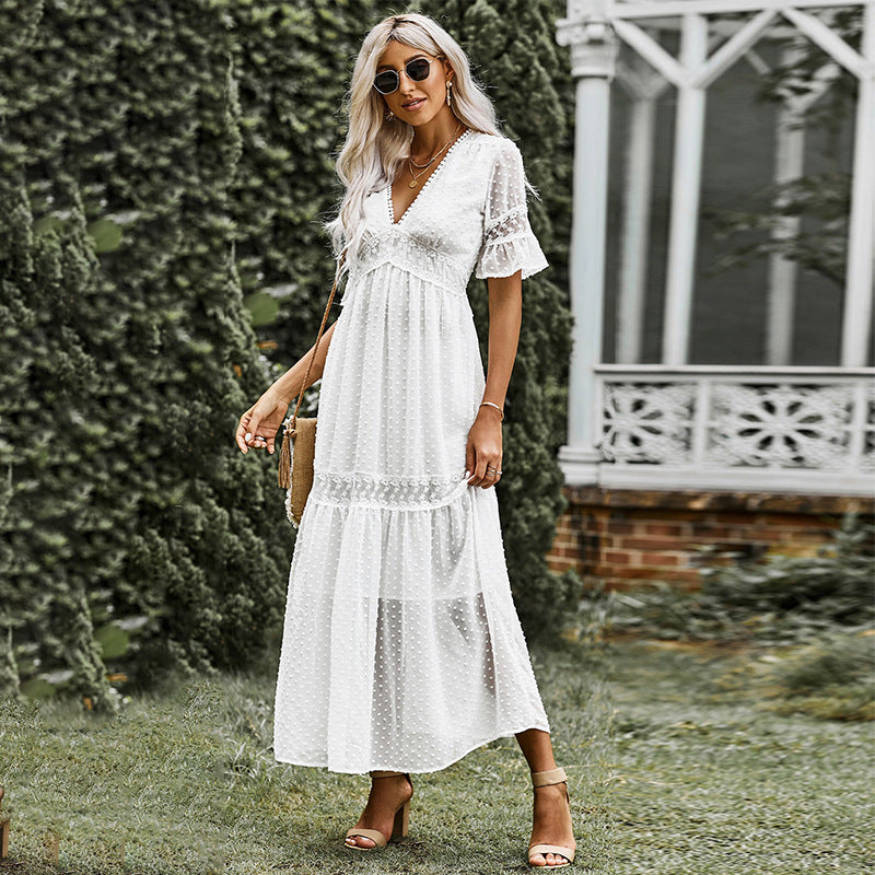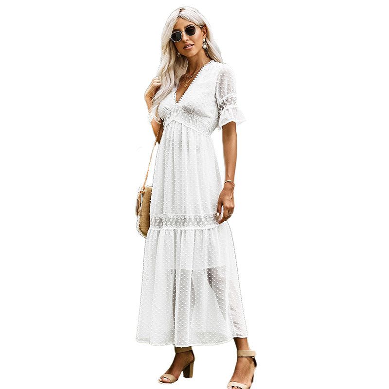 Summer Short Sleeve Dress Women Solid Color Lace V-neck Maxi Dress