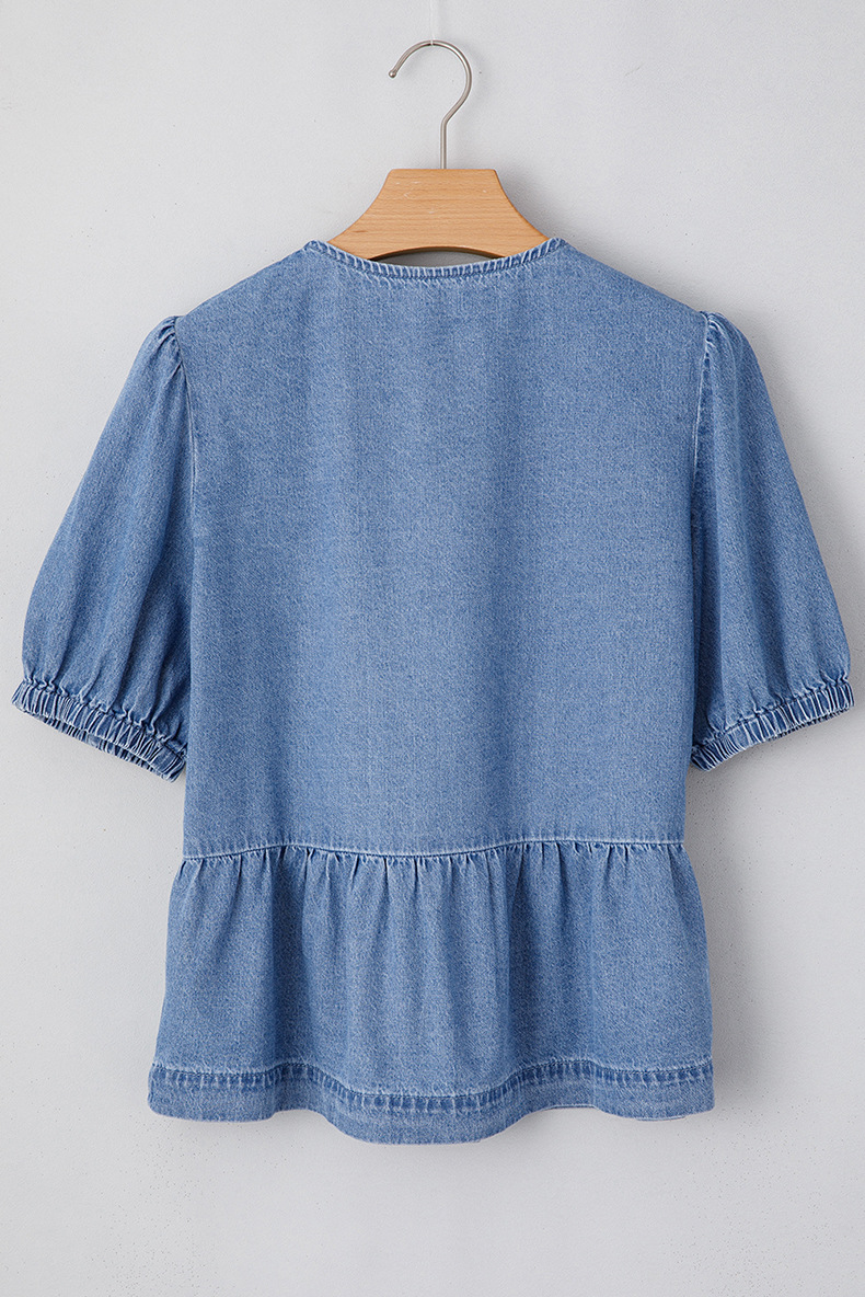 Summer Solid Color Denim Shirt Women Casual All Matching Pullover round Neck Puff Sleeve Top Women