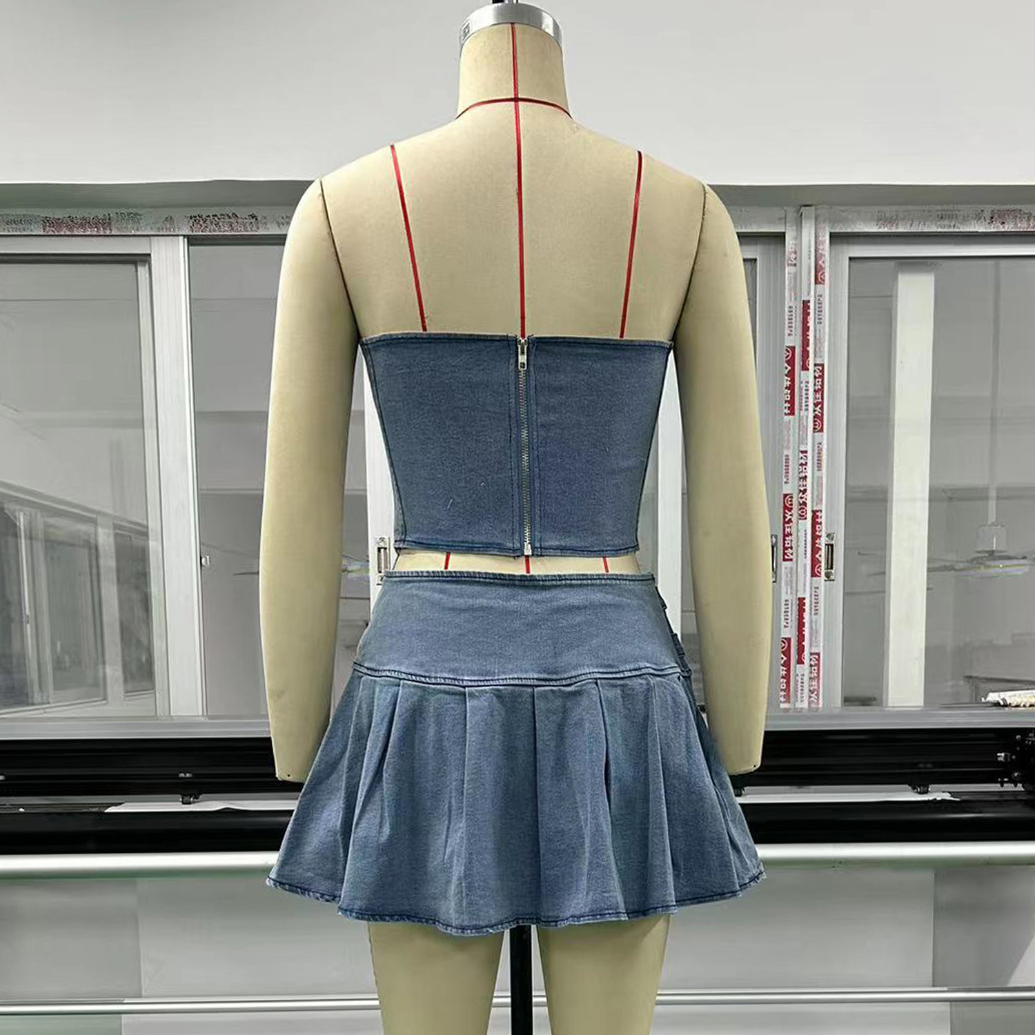 Summer Tube Top Denim Suit Sleeveless Sexy Sexy Bare Cropped High Waist Split Skirt