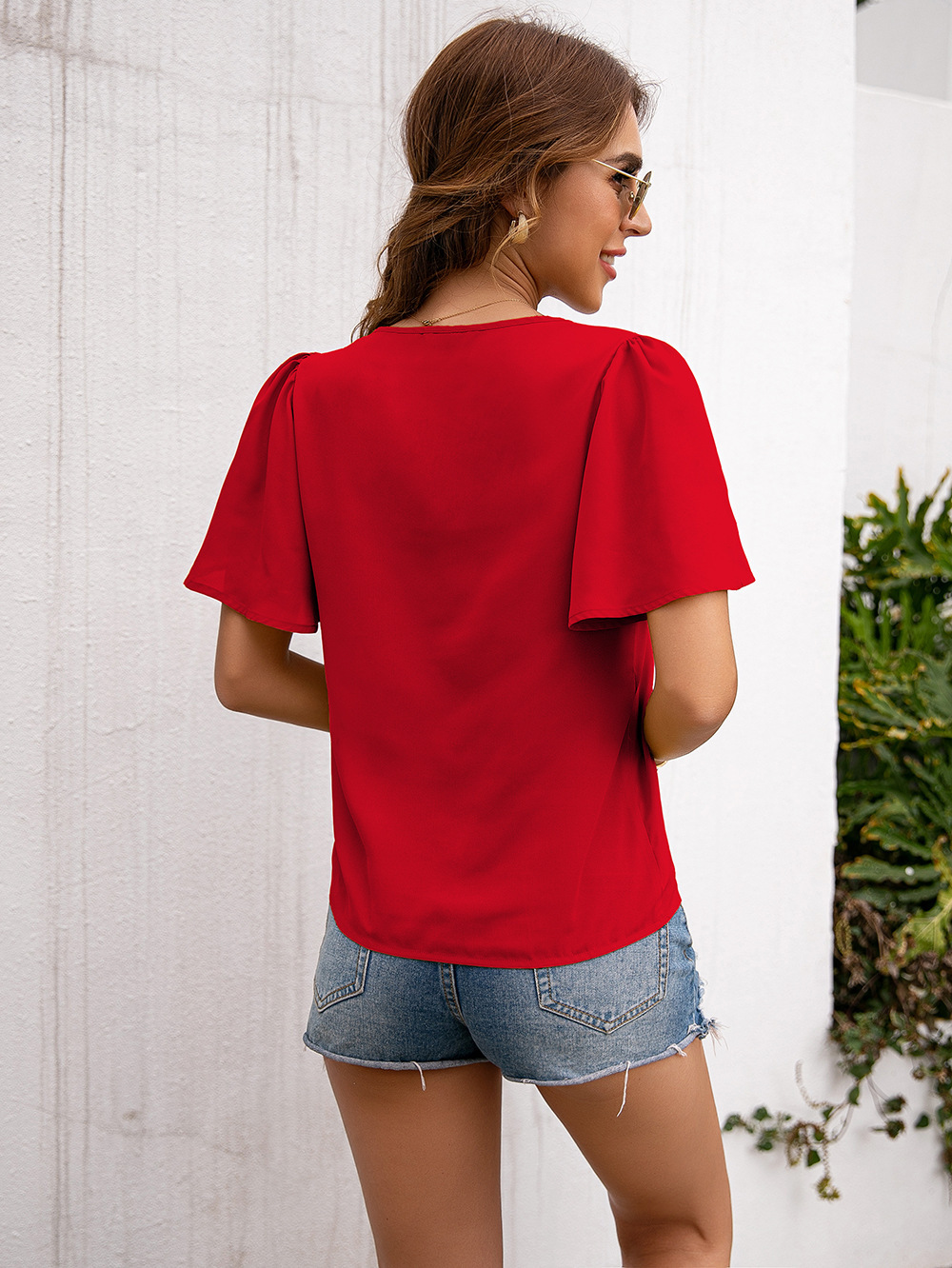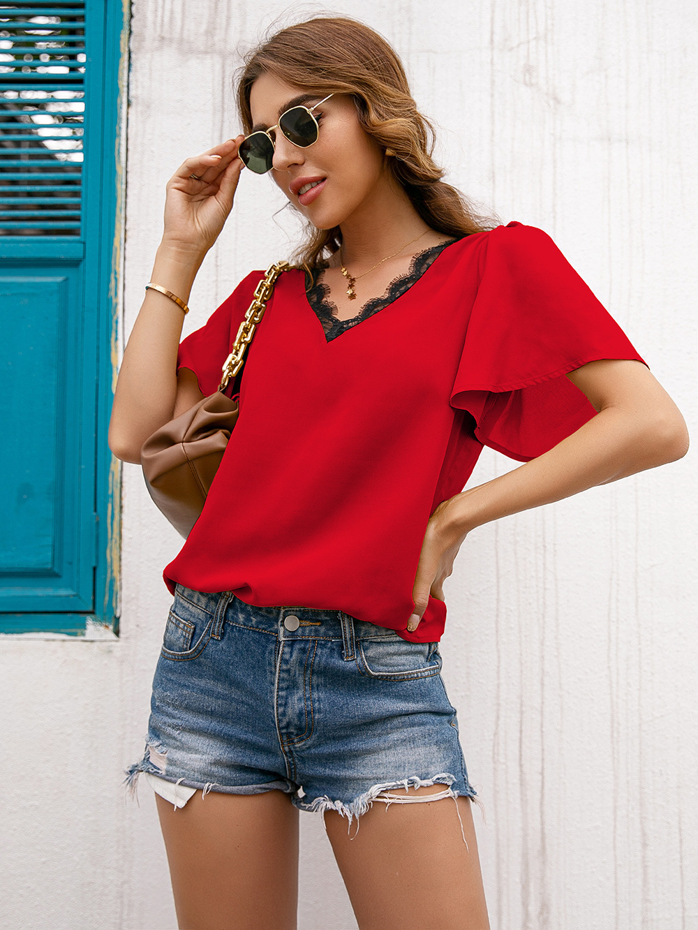 Summer V neck Stitching Eyelash Lace Ruffle Sleeve Loose Solid Color Top for Women