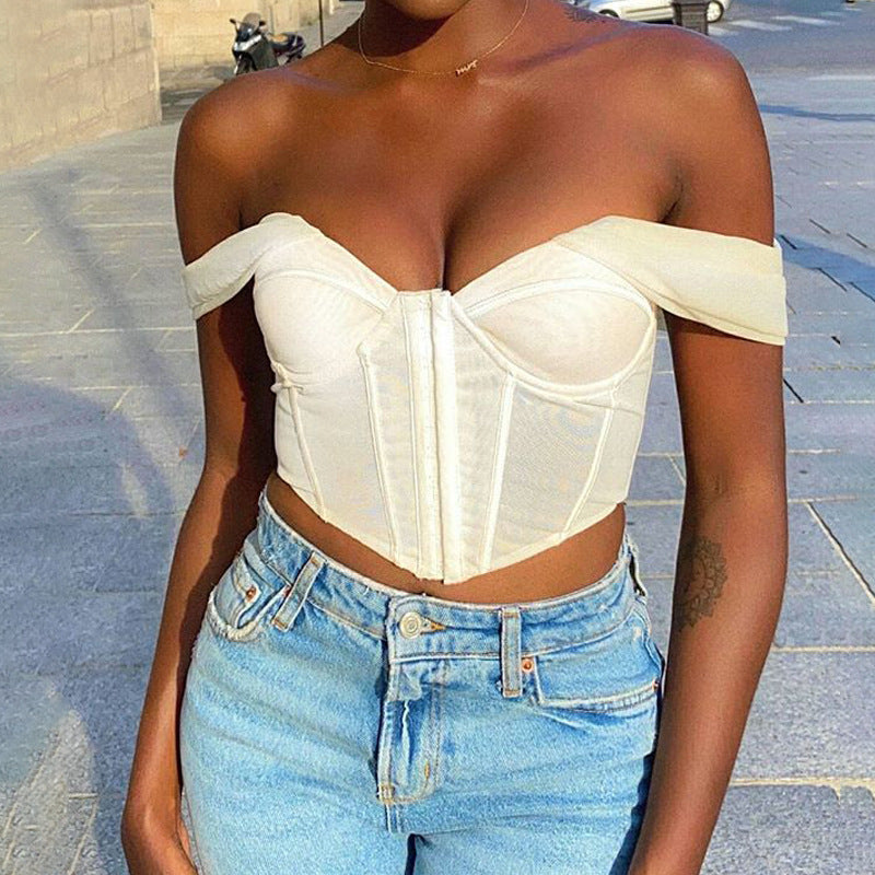 Women Clothing off Shoulder Mesh Solid Color Sexy Bandeau Crop-Top Short Top Women