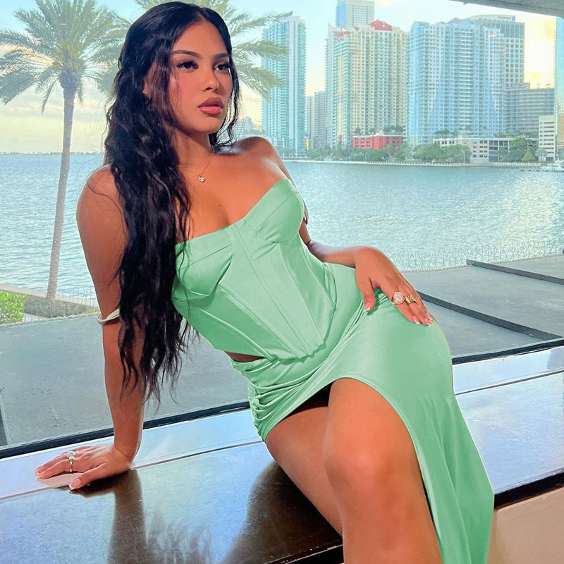 Women Clothing Summer Sexy Boning Corset Sling Bandeau Slim Fit Split Skirt Set