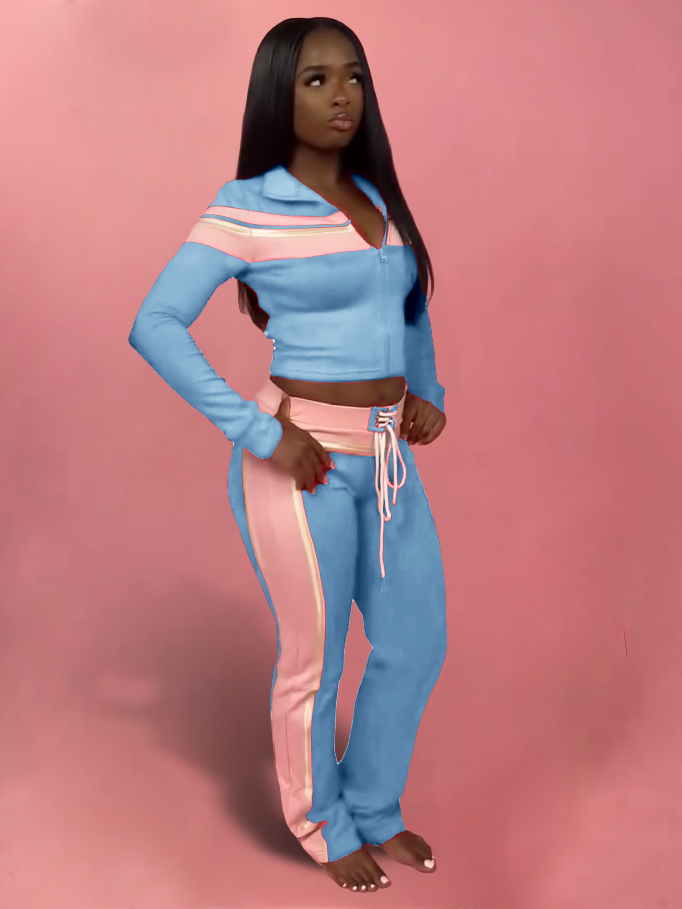 Women Wear Printed Patchwork Long Sleeves Shoulder Strap Adjustable Buckle Lace up Trousers Three Piece Sets Women
