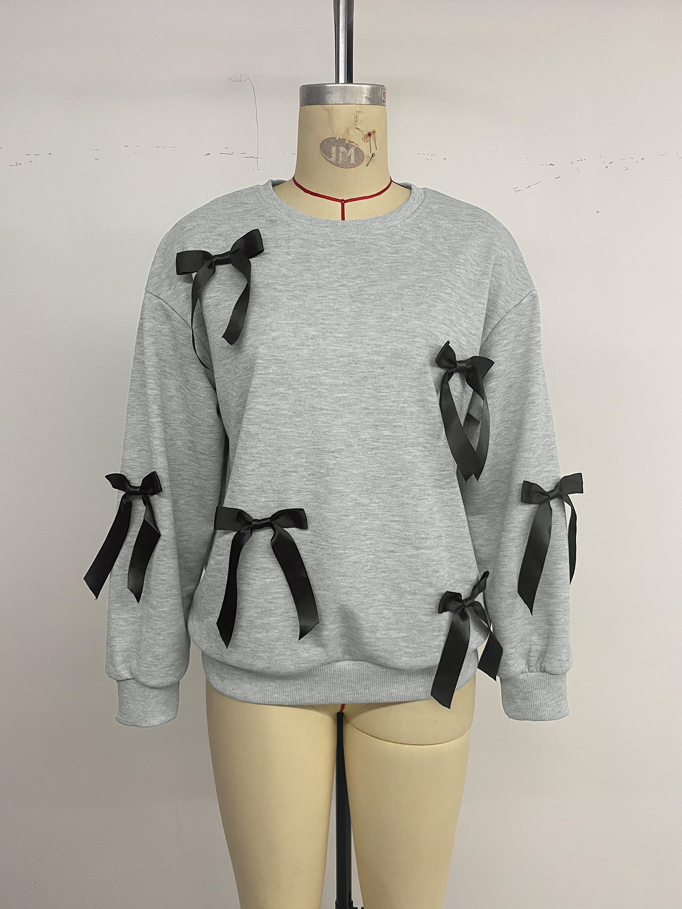 Autumn Casual Sweet Top Bow Decoration Gray round Collar Sweater Women