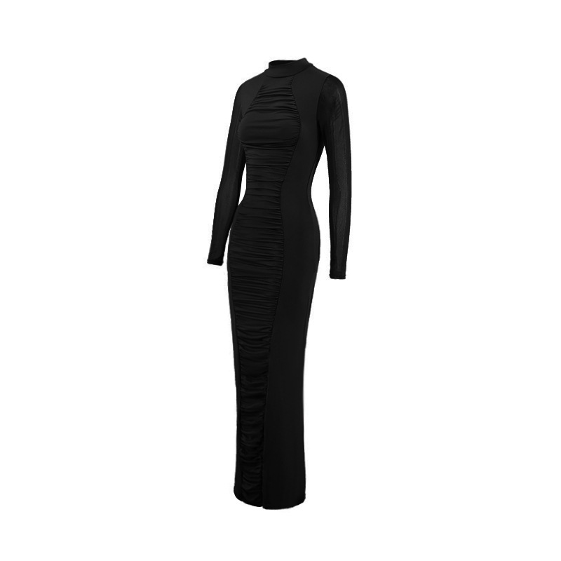 Autumn Elegant Socialite Private Clothes Pleated Turtleneck Long Sleeve Waist Tight Hip Slim Fit Dress