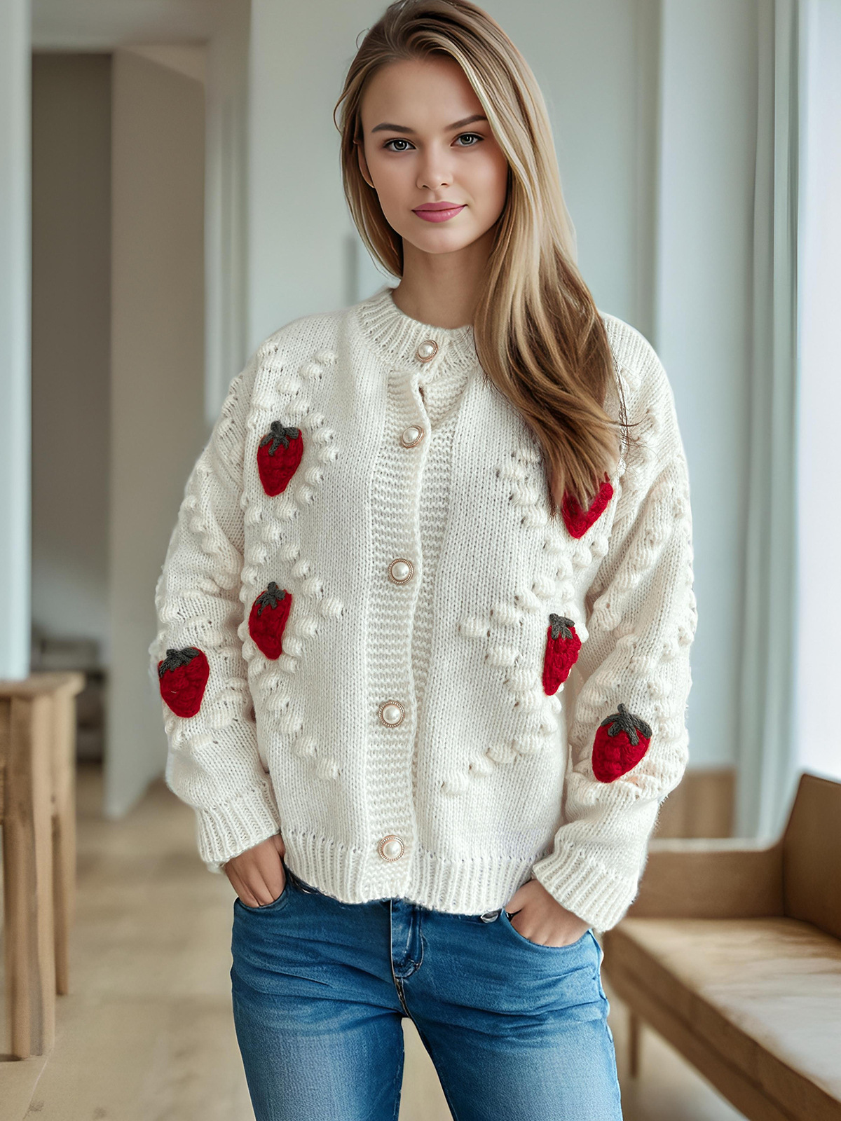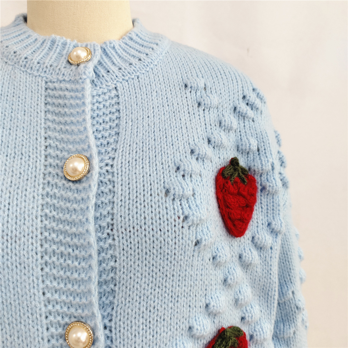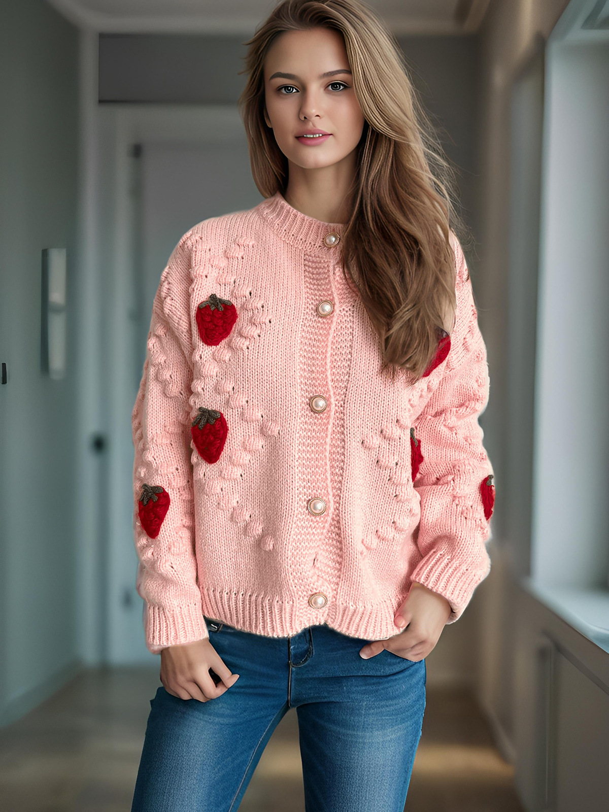 Autumn Winter Crocheted Embroidery Three Dimensional Strawberry Twist Pearl Buckle Knitted Sweater Cardigan Coat