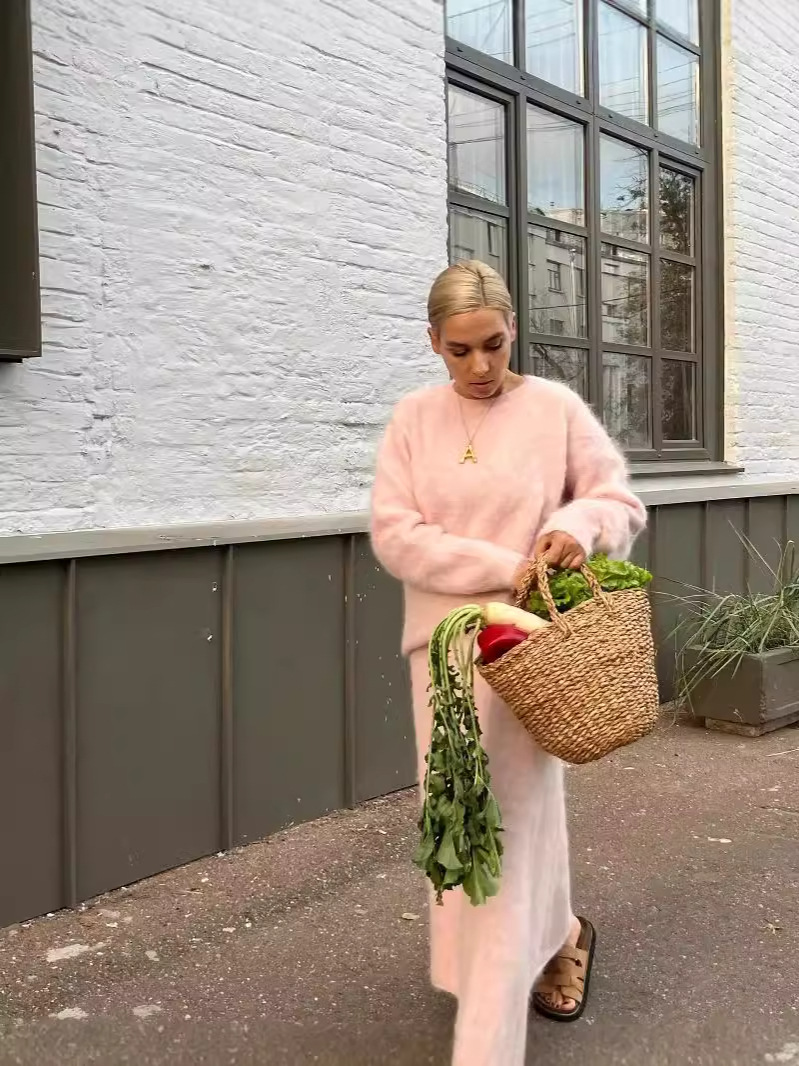 Autumn Winter Elegant Soft Thickened Round Neck Sweater Fishtail Skirt Two Piece Set Women Office Lady Top Skirt Set