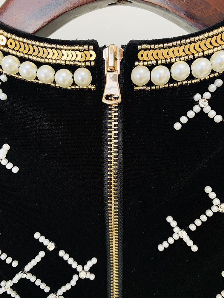 Autumn Winter Heavy Industry Embroidery Sequined Diamonds Bead Long Sleeve Gold Velvet Sheath Dress