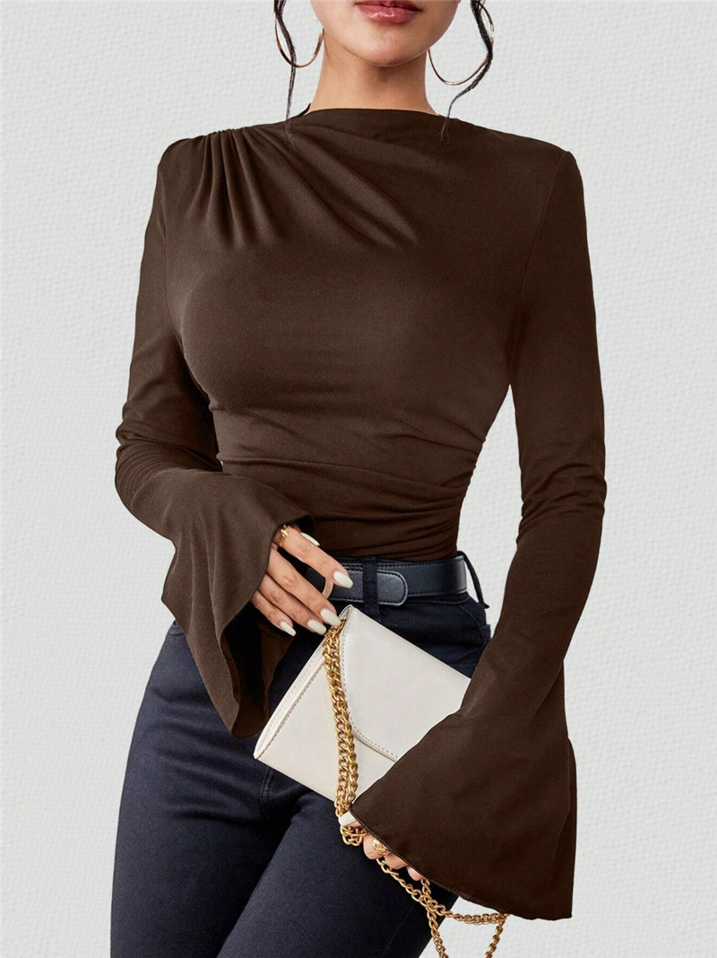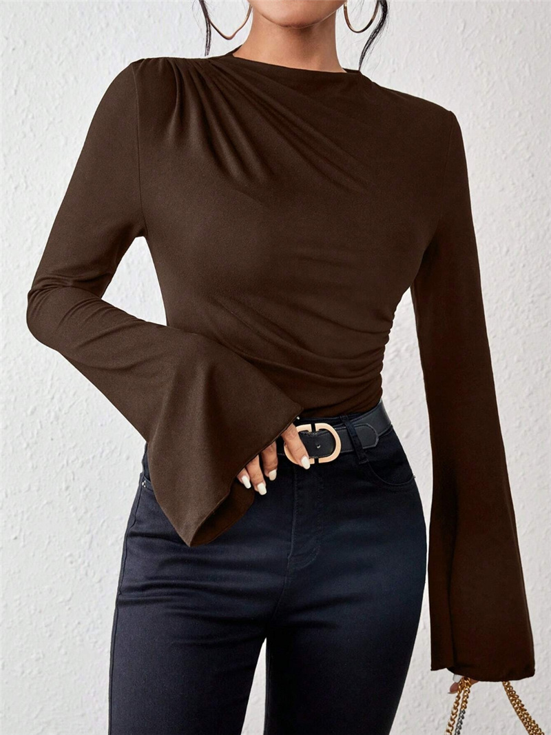 Autumn Winter Pleating Bell Sleeve Stand up Collar Slim Fit T shirt