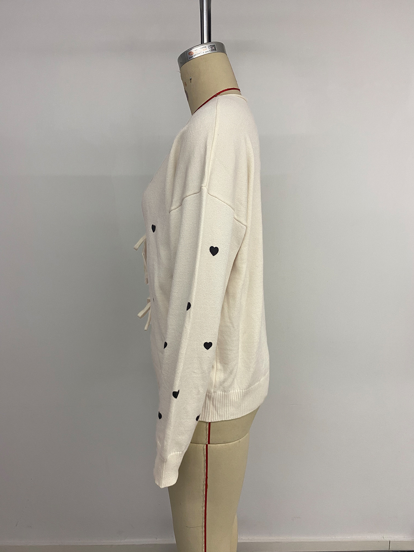 Autumn Winter Sweet Cute Love Pattern V neck Lace up Cardigan Sweater Coat