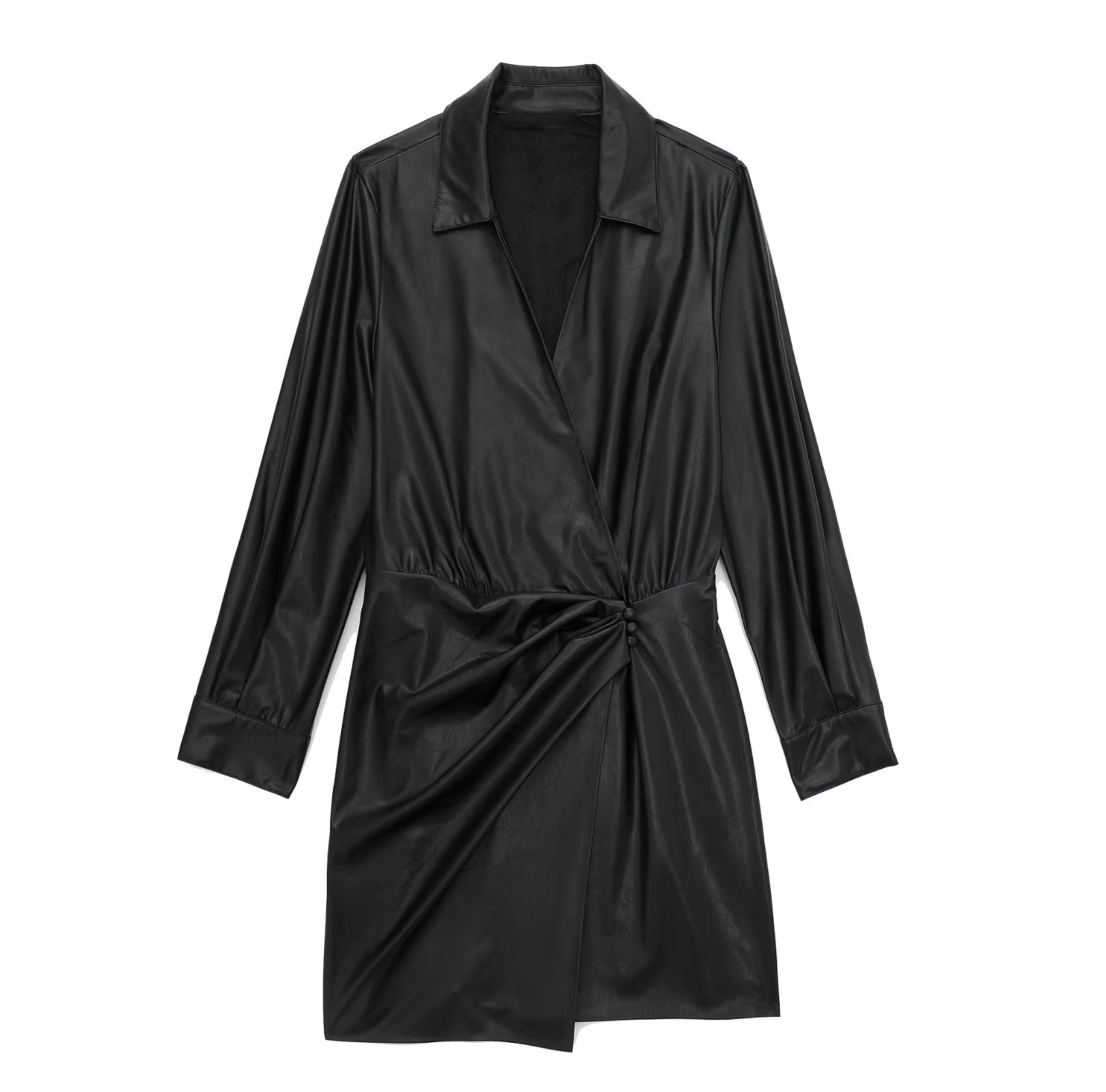 Autumn Women Clothing Faux Leather Pleated Decorative Dress