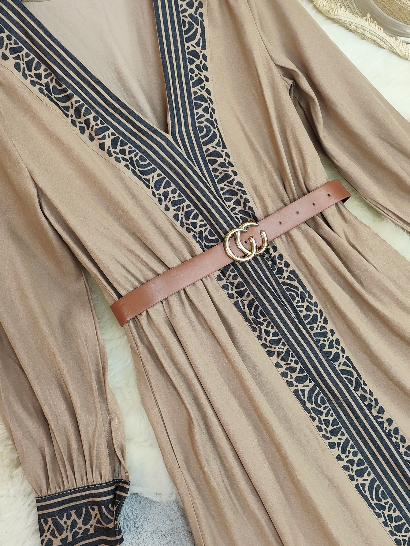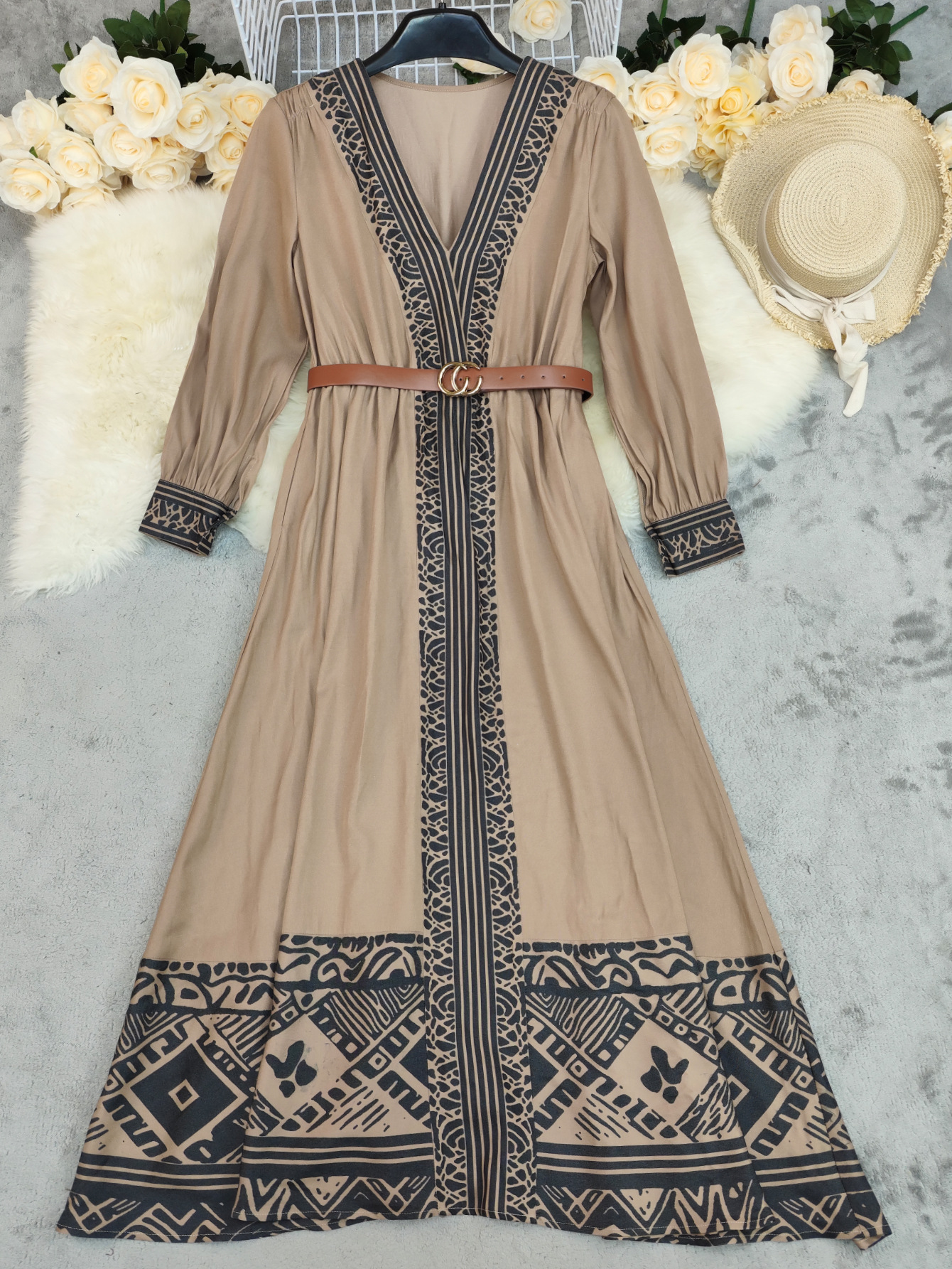 Autumn Women Long Sleeve Printed V neck Maxi Dress