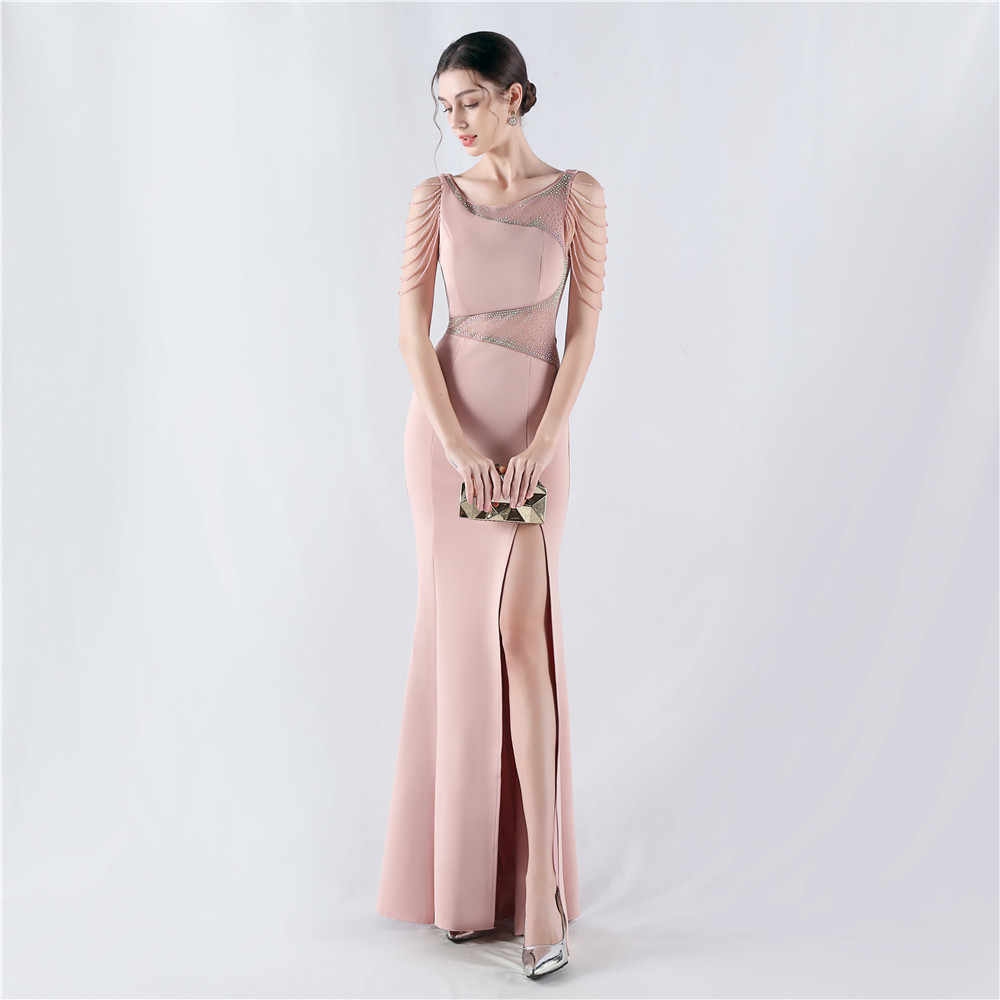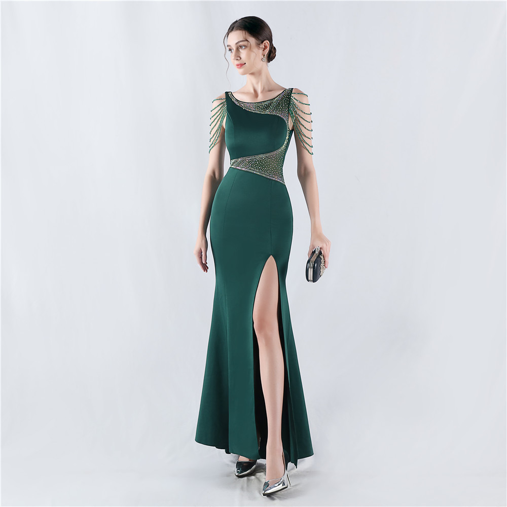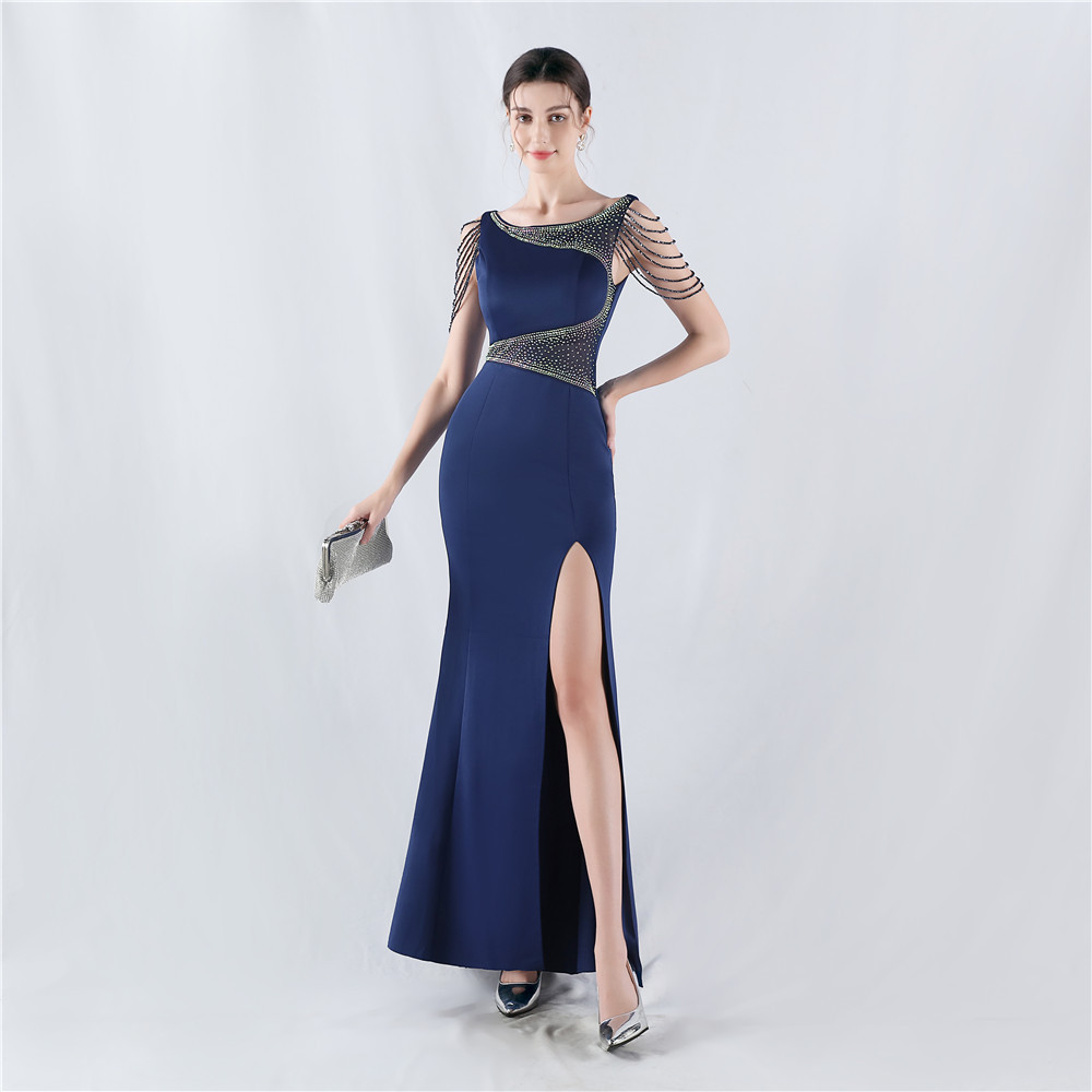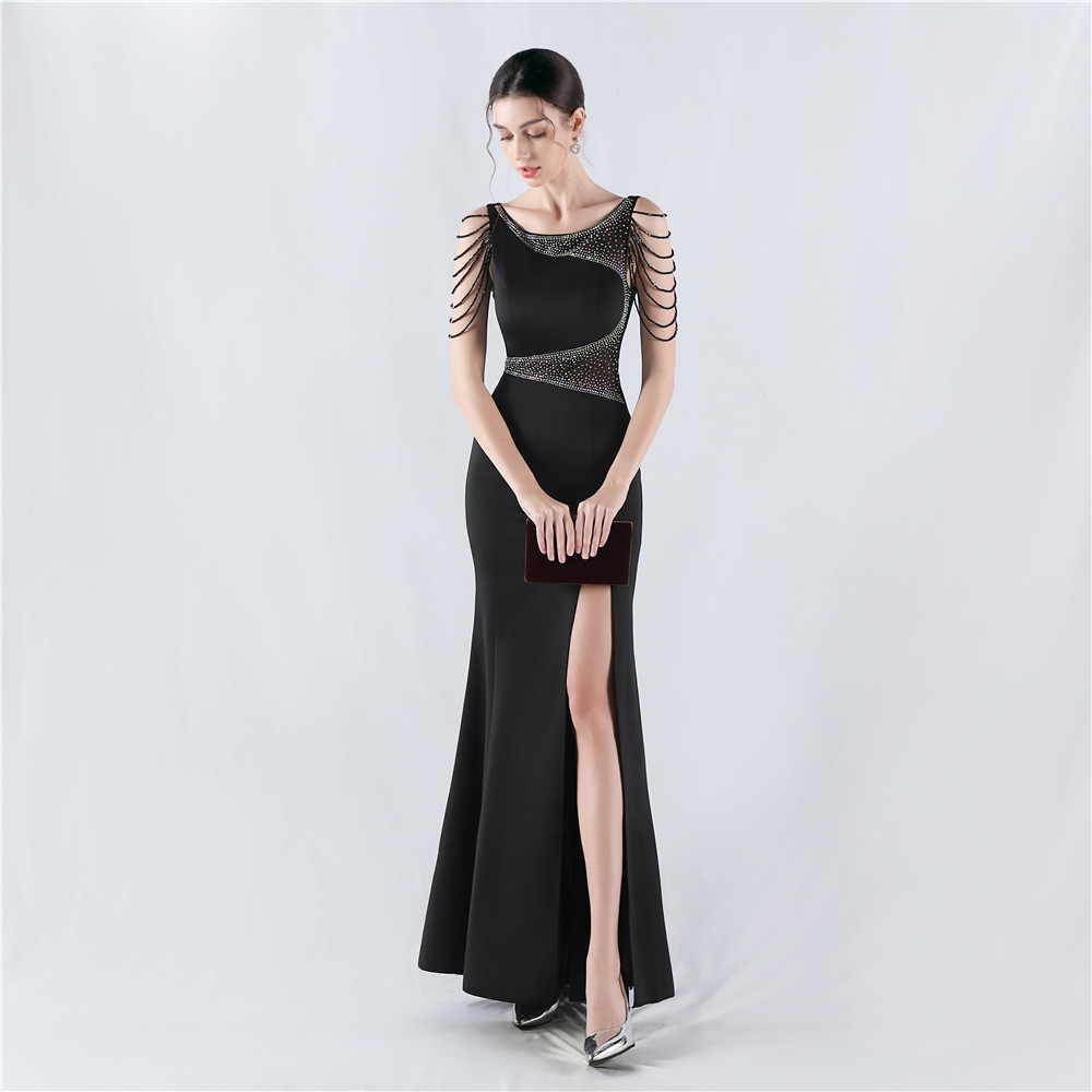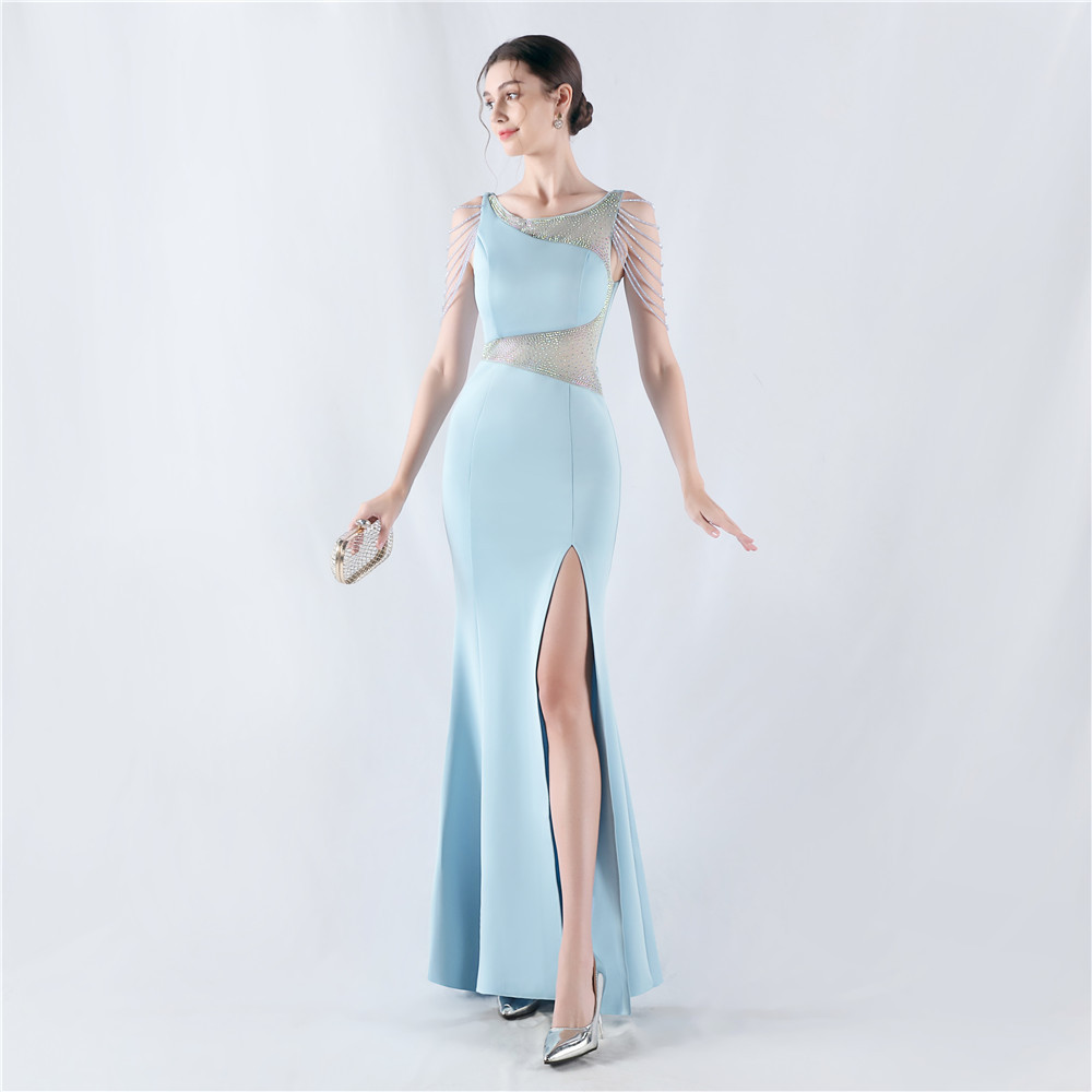 Dress Heavy Embroidery Drilling Give Sheer Mesh High Fork Satin Evening Dress Annual Meeting Wedding
