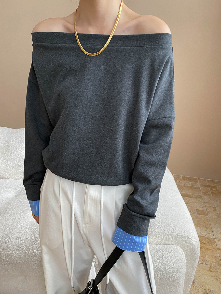 Early Autumn Blogger off Shoulder Design Striped Stitching Long Sleeve T shirt