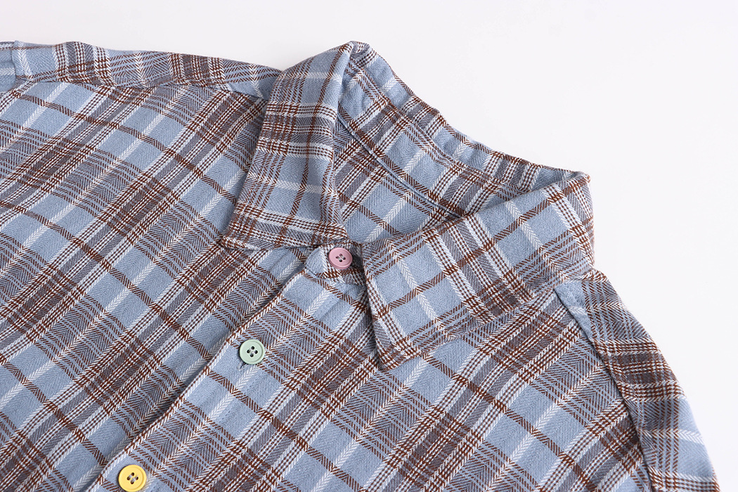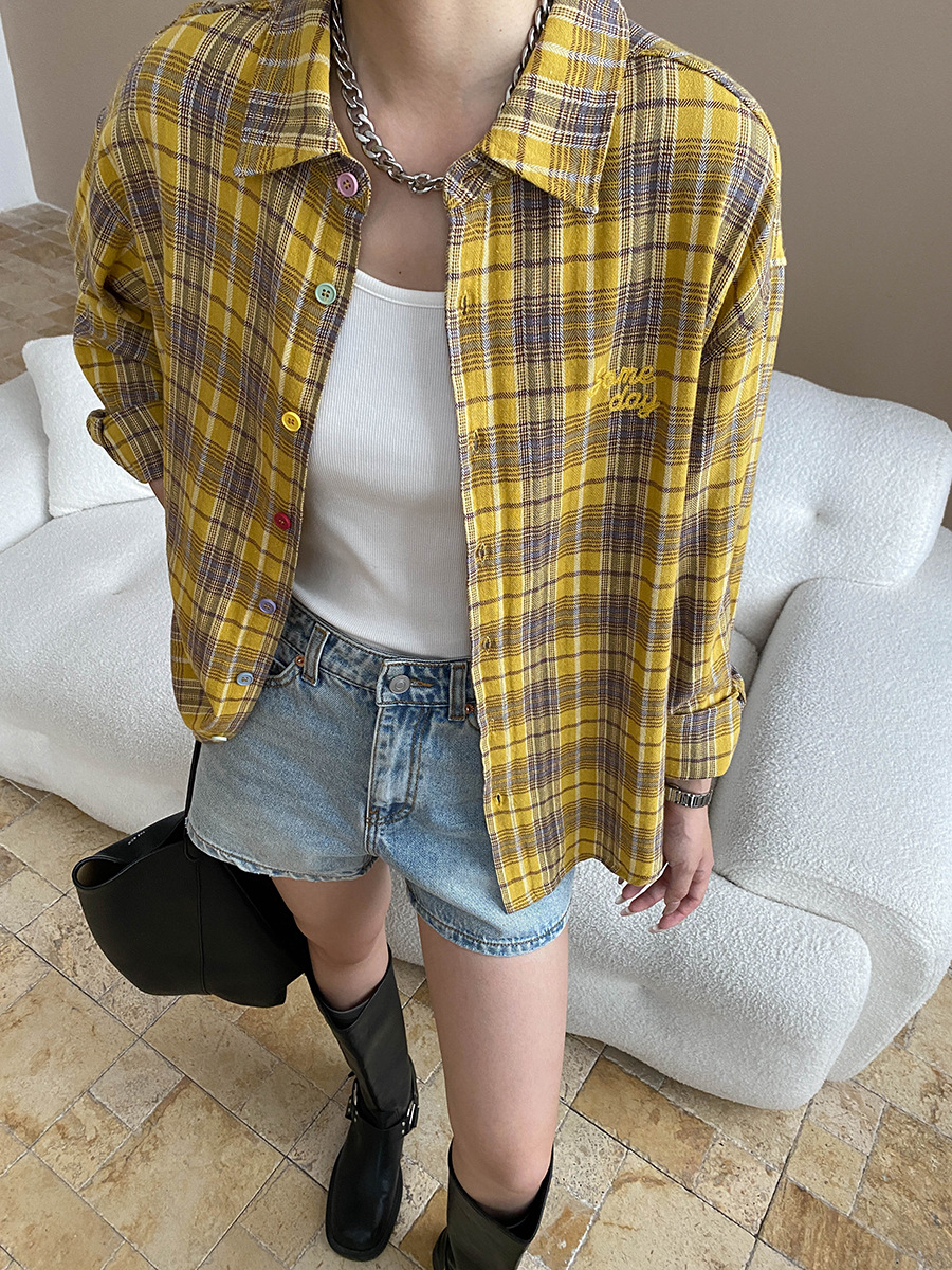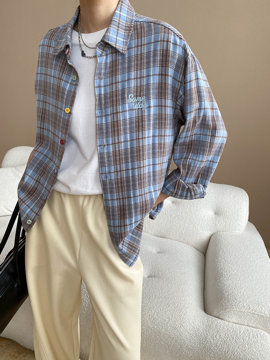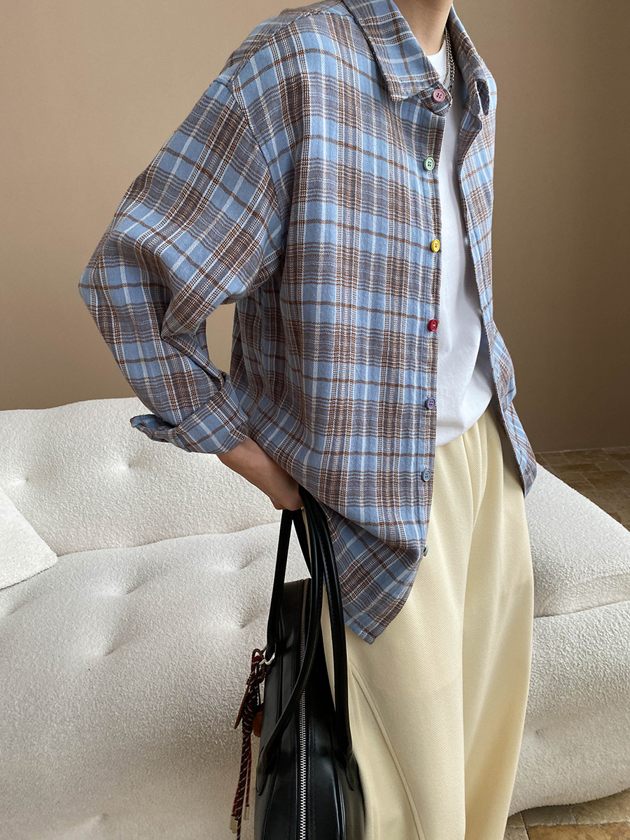 Early Autumn Color Button Design Loose All Cotton Plaid Long Sleeve Shirt