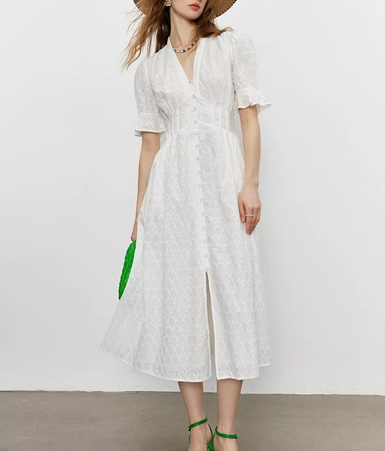 Elegant Hollow Out Cutout Embroidered Waist Slimming V Neckline Breasted Short Sleeve Dress