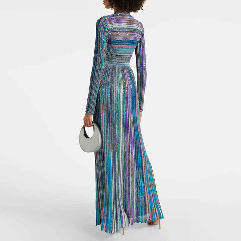 Elegant Knitted Dress Women Autumn Colorful Striped Low Collar High Waist Slimming Maxi Dress