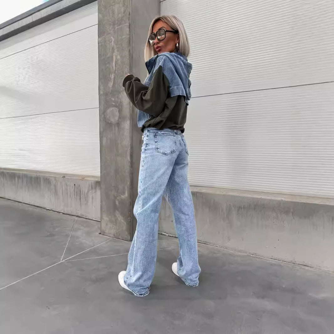 Fall Loose Casual Washing Water Denim Stitching Hooded Women Sweatshirt