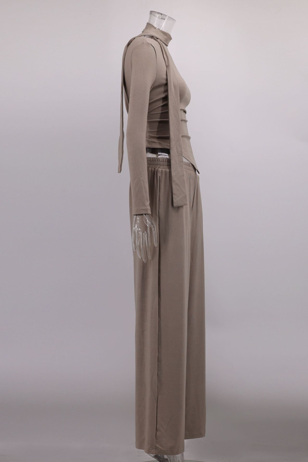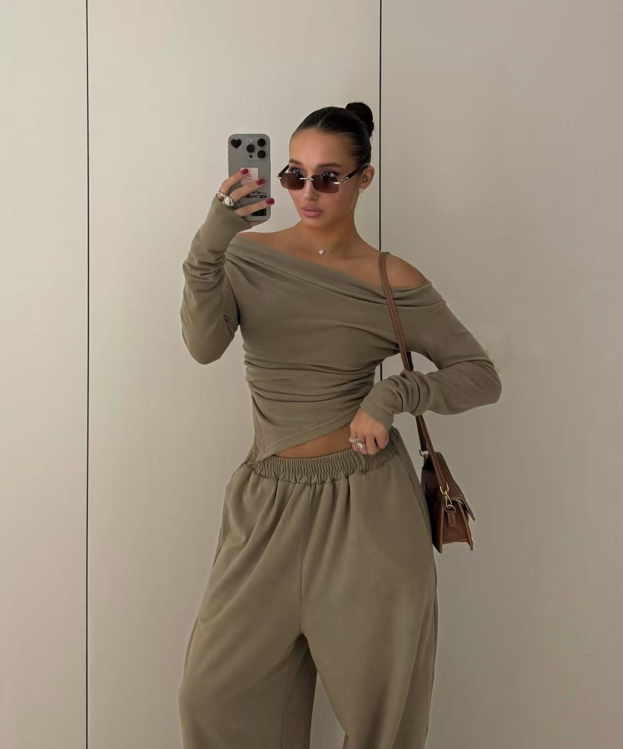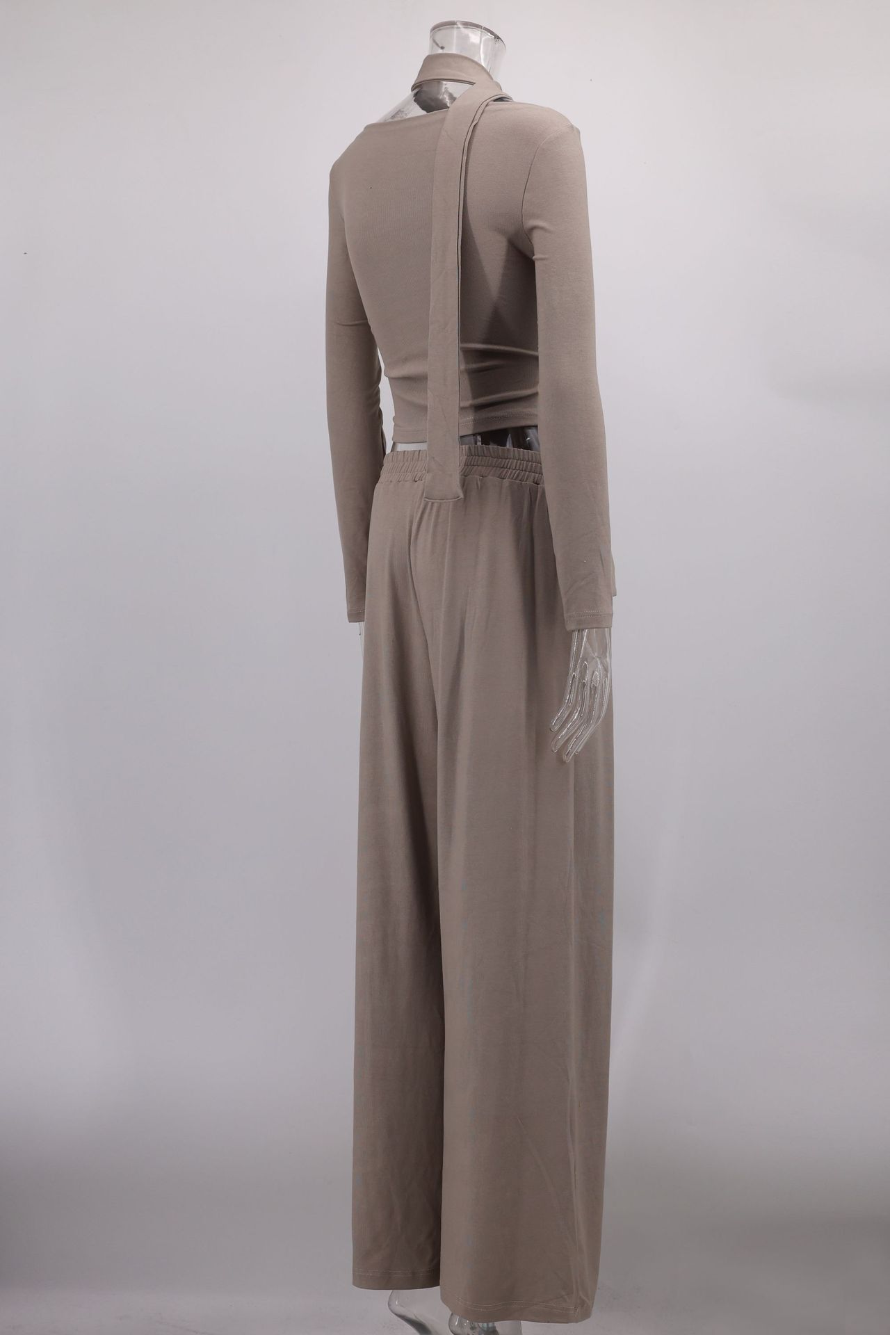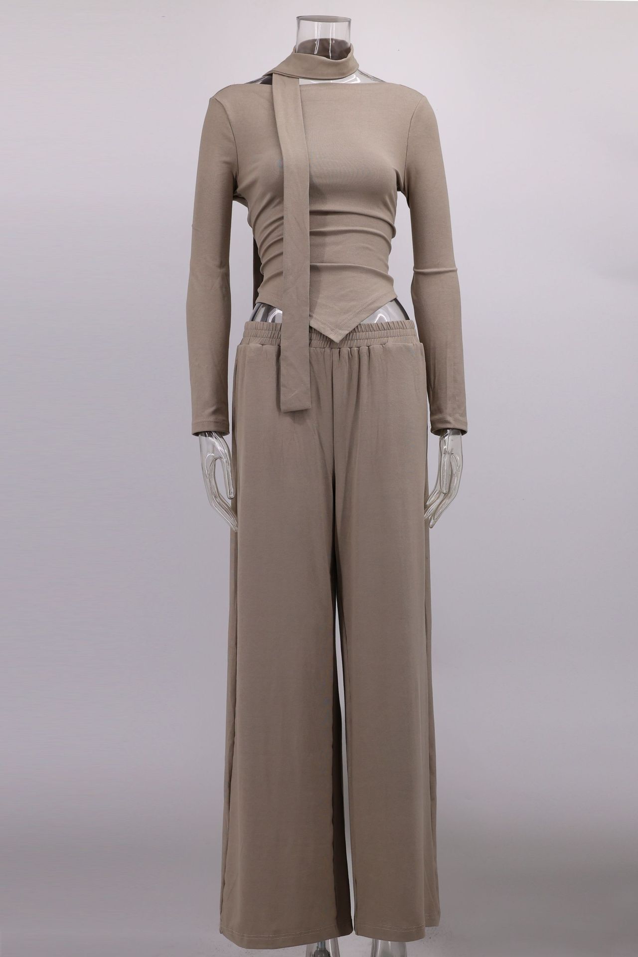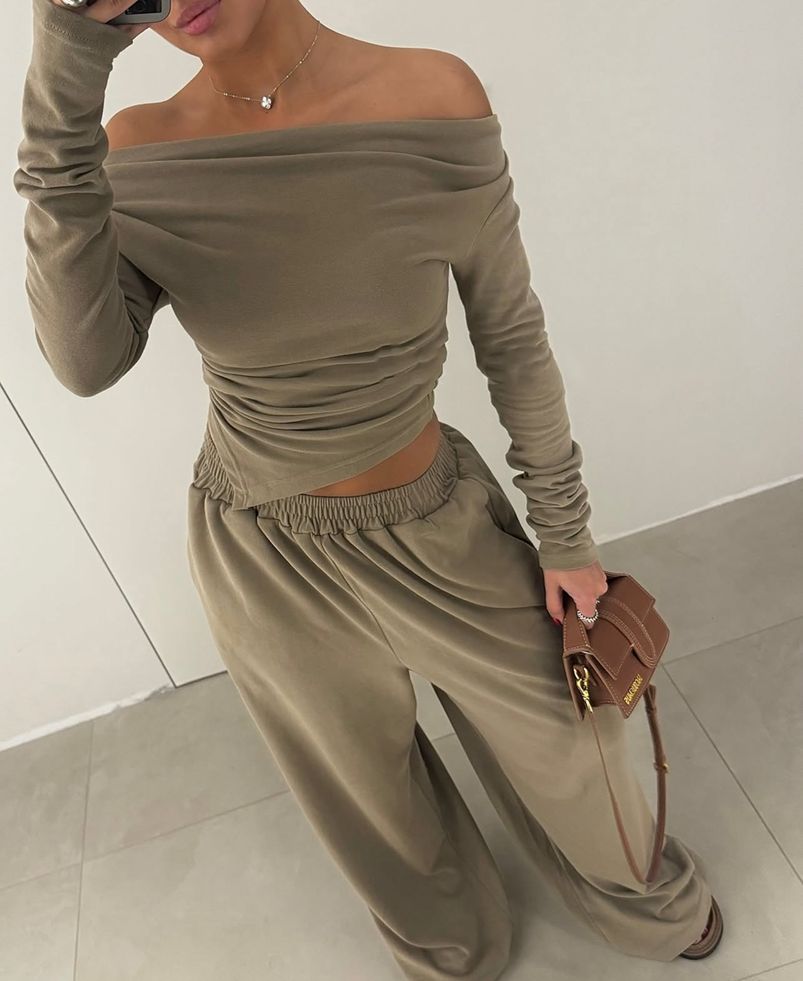 Fall off Neck Asymmetric Hem Long T shirt Straight Leg Trousers Casual Two Piece Sets