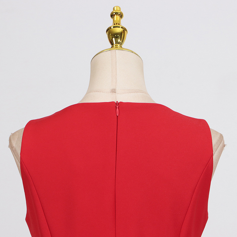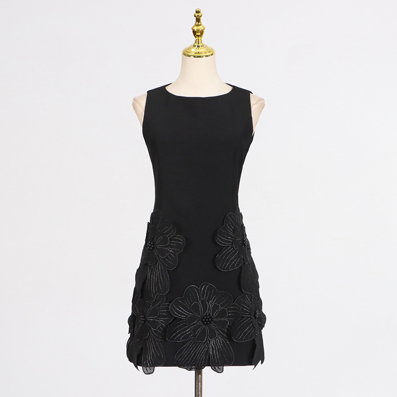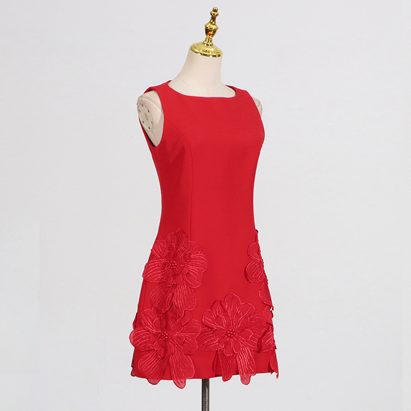 French Sweet Date Short Dress Summer round Neck Sleeveless Waist Design Three Dimensional Floral Dress