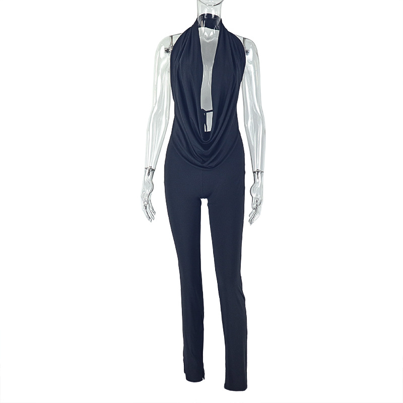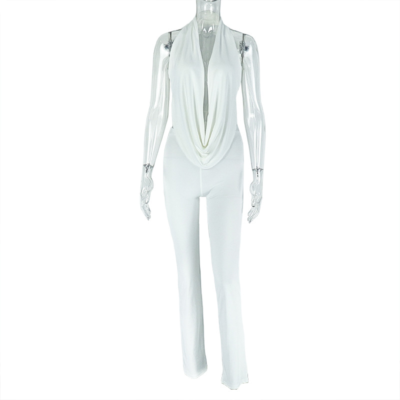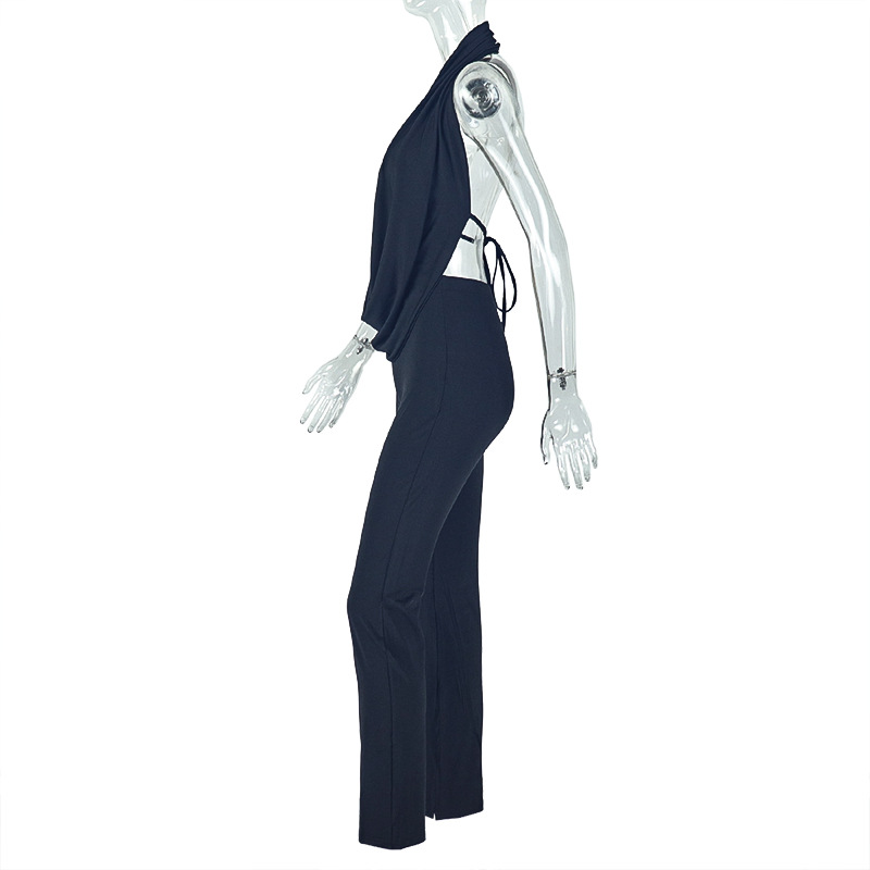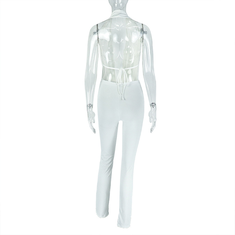 Halter Swing Collar Solid Color Commuting Pants Set Backless Lace up Top Tight Trousers Two Piece Set