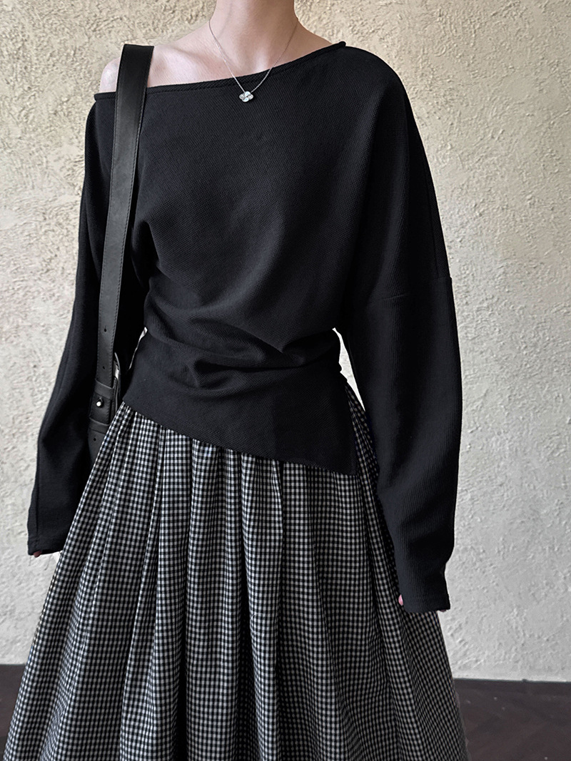 High Grade Irregular Asymmetric Shoulder Sweater Women Special Interest Design Fold Split Waist Controlled Top