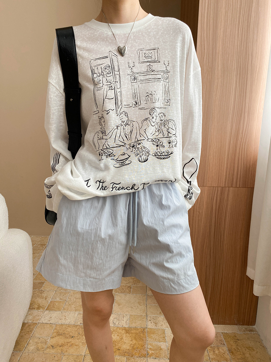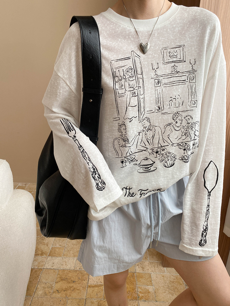 Idle Fun Cartoon Graffiti Letter Graphic Print round Neck Loose Long Sleeves T shirt