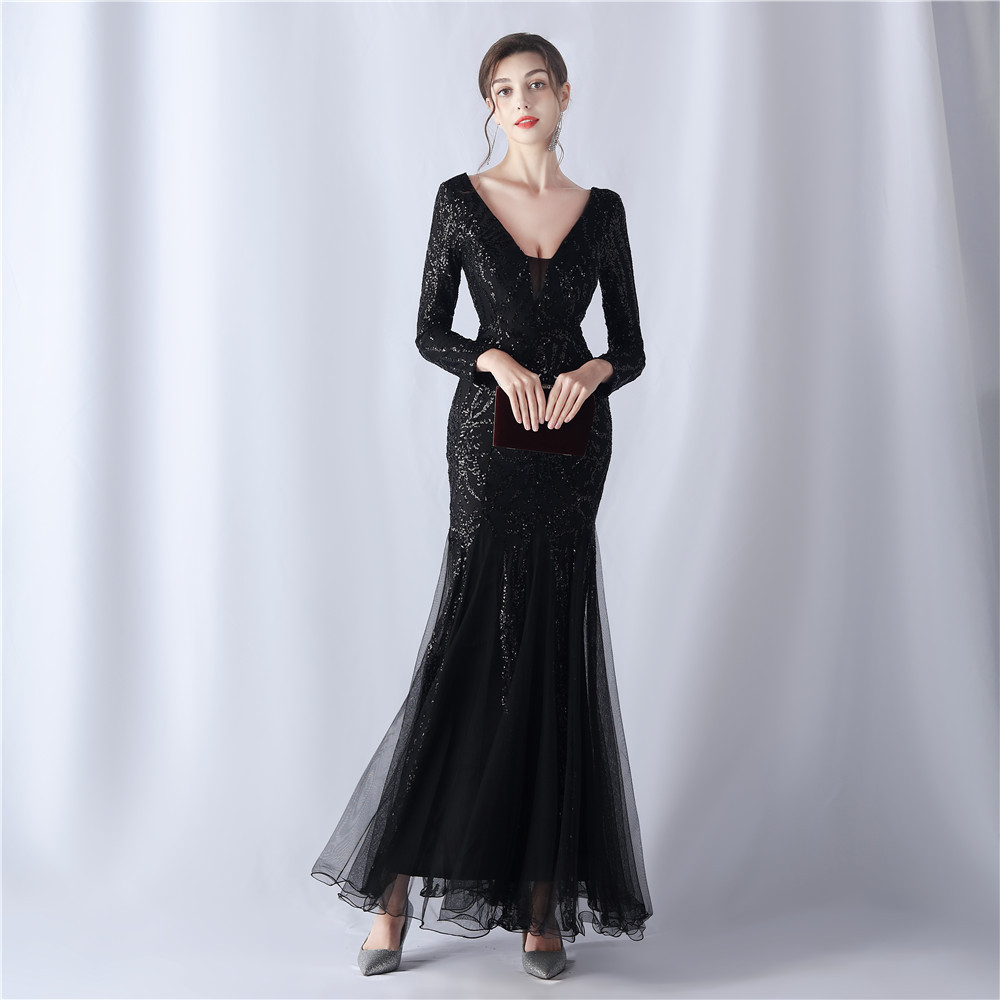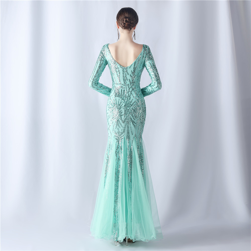 Mesh Sequin Wedding Dinner Annual Meeting Host Long Sleeve Evening Dress