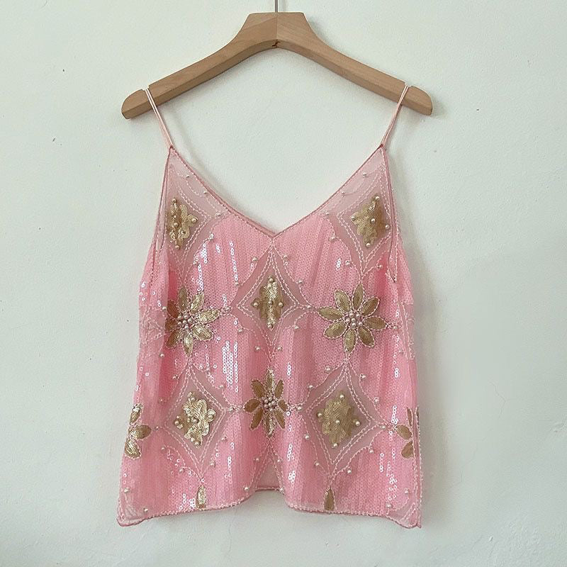 【MOQ-5 packs】 Niche Summer Women Heavy Embroidery Sequ Beaded Sling Basic Sexy Slimming Short V neck Vest Western Sexy
