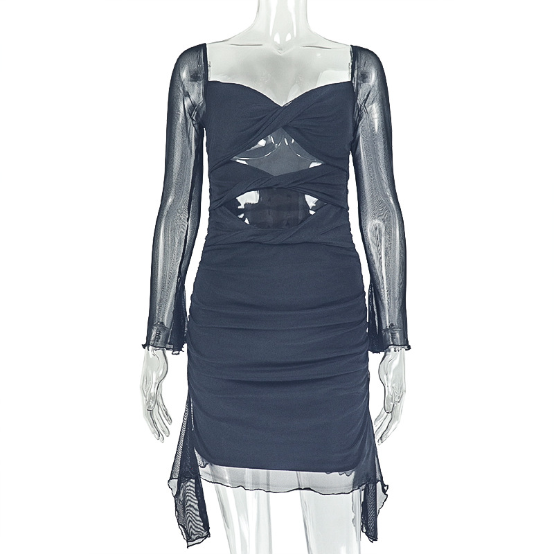Personalized Design Women Hollow Out Cutout Pleated Hip U Neck Long Sleeved Solid Color Short Dress