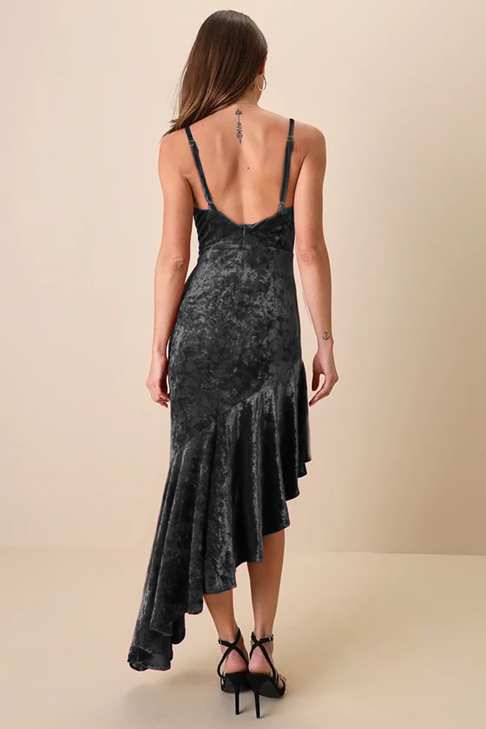 Pleuche Spaghetti Strap Dress Sexy Patchwork Ruffled Sheath Fishtail Dress