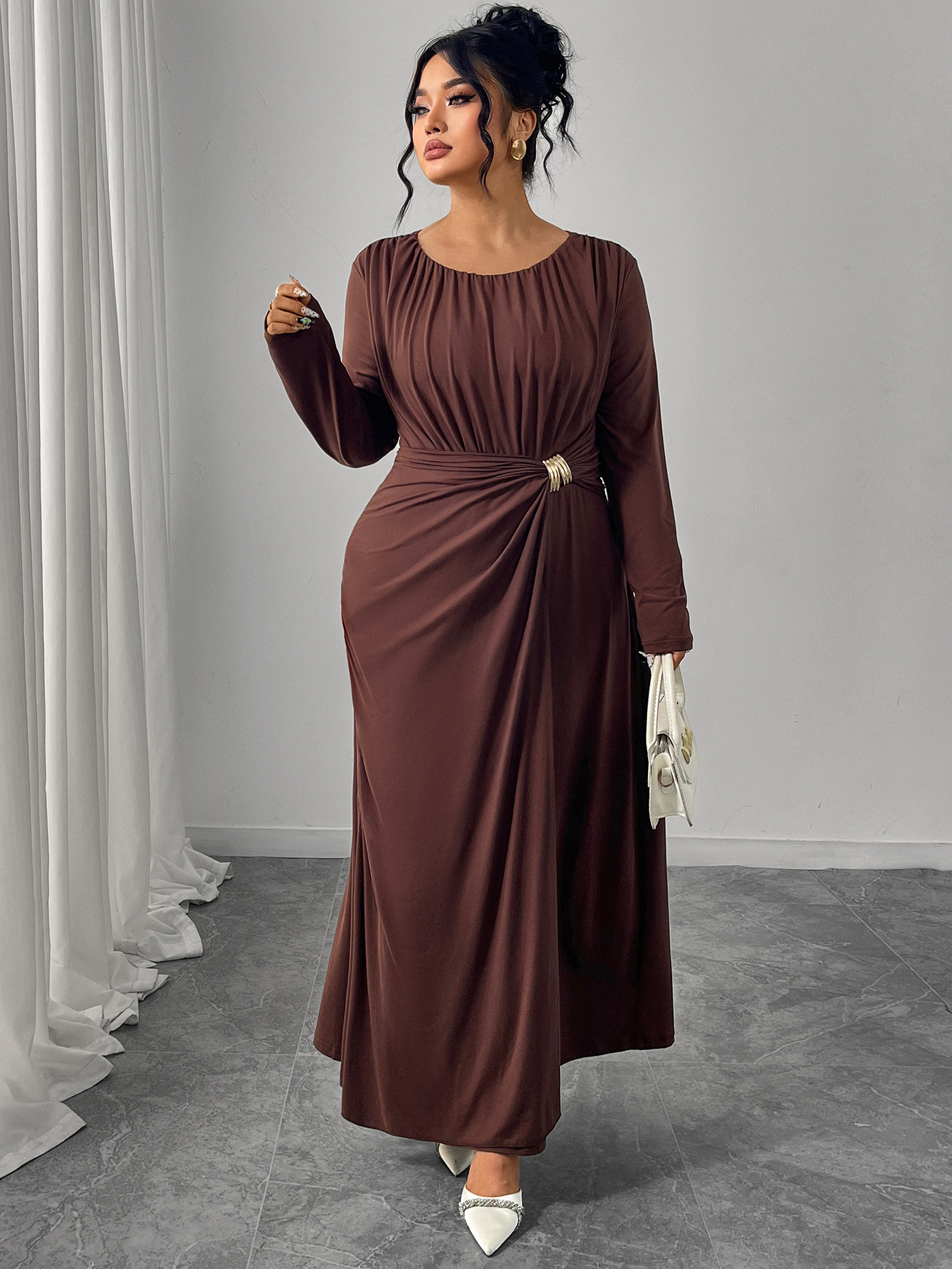 Plus Size Autumn Winter Brown Dress Women Clothes round Neck Long Sleeve Waist Design Pleated Dress
