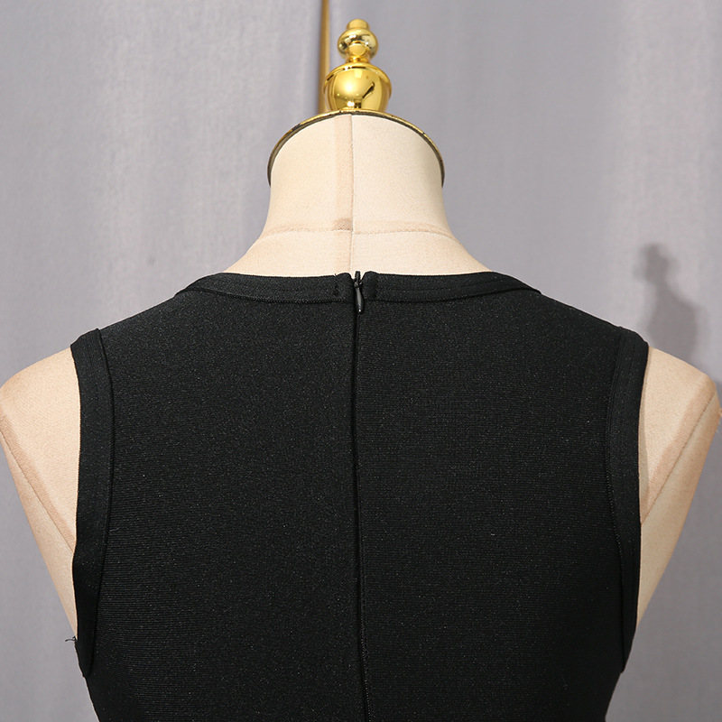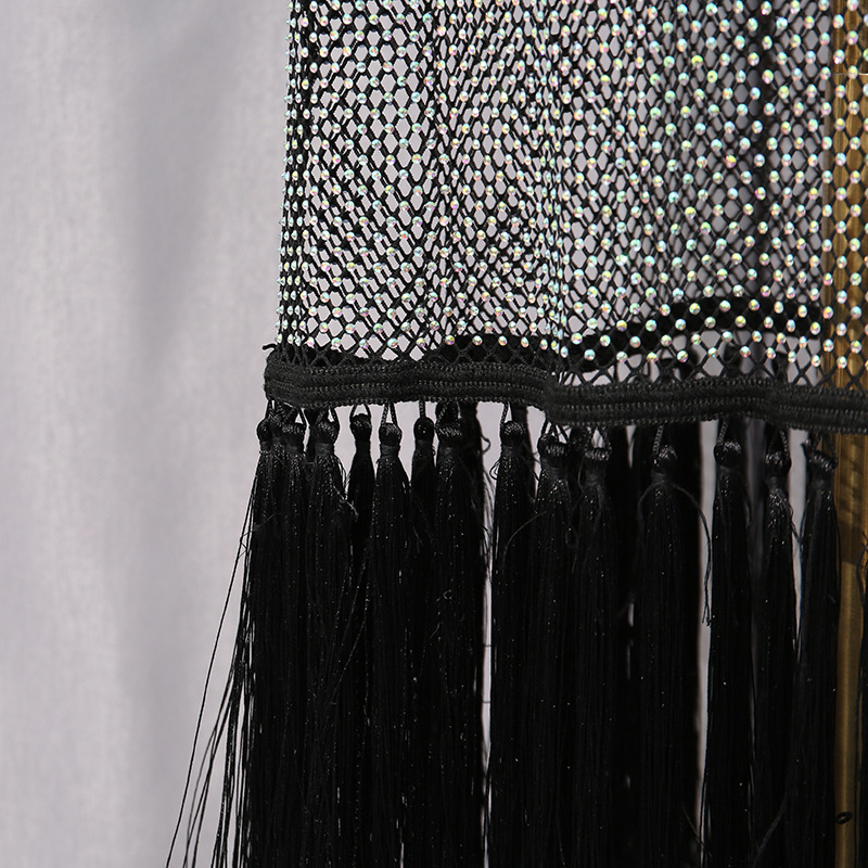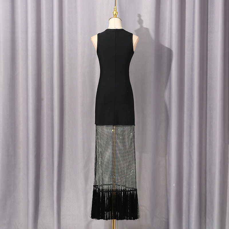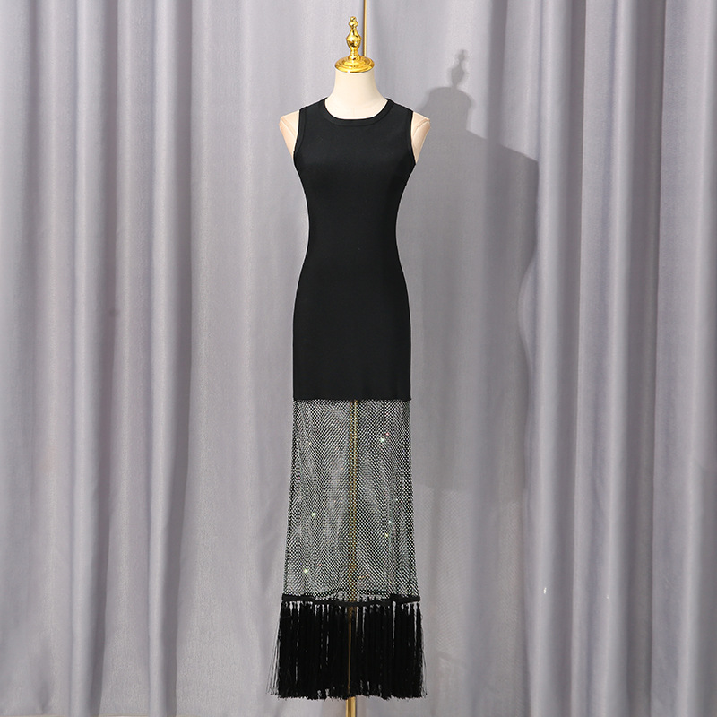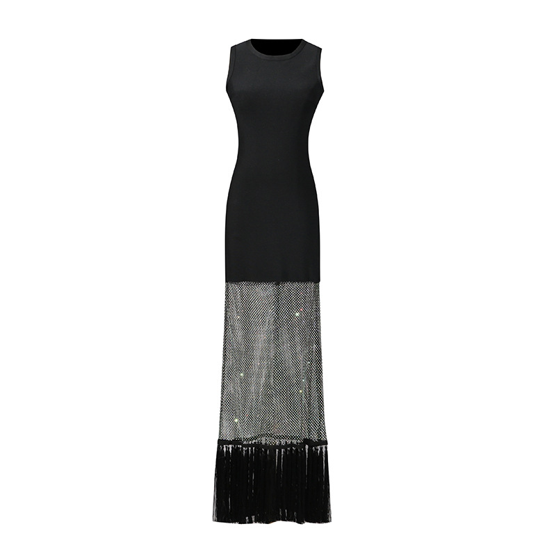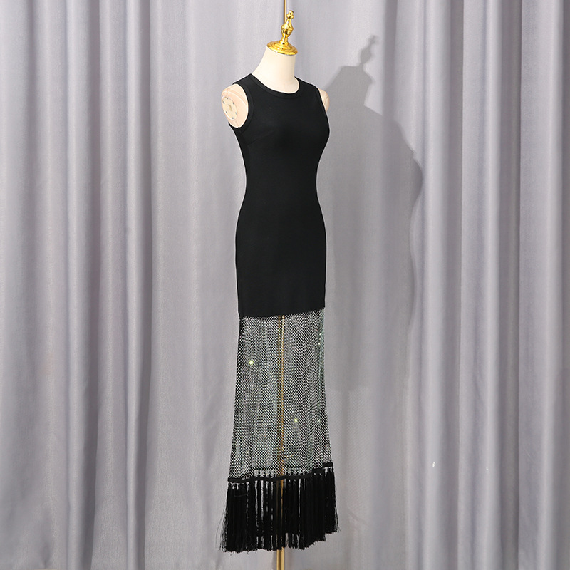 Pure Black Phantom round Neck Sleeveless Waist Slimming Maxi Dress Autumn Hollow Out Cutout Jeweled See through Tassel Dress