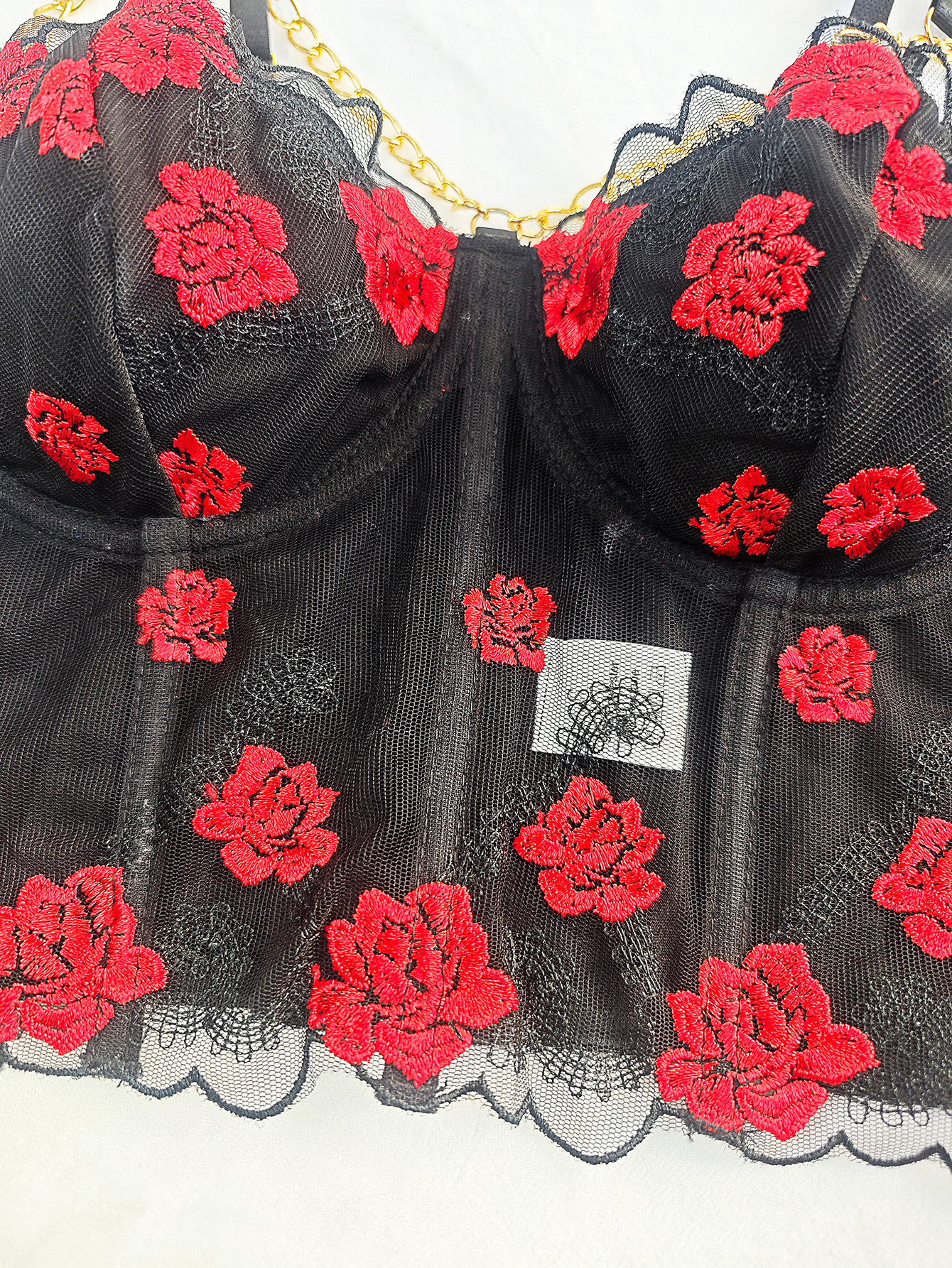 Element: Embroidery,Boning,Cutout,Lace/Tulle/Fishnet,Metal Chain,hook closure
