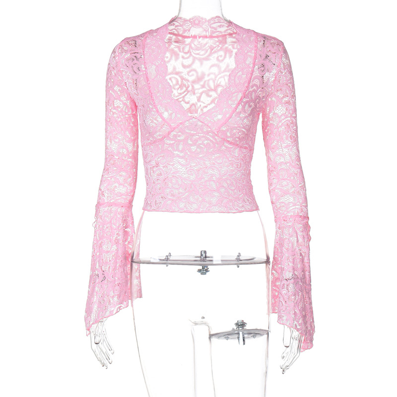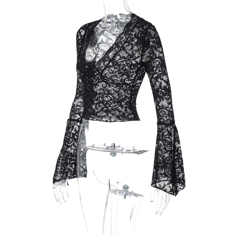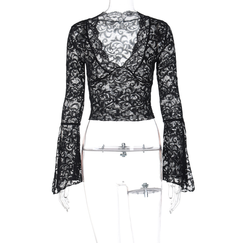 Sexy Deep V Plunge Slim Fit All Matching Short Cropped Lace Long Sleeved Sexy Lace Top