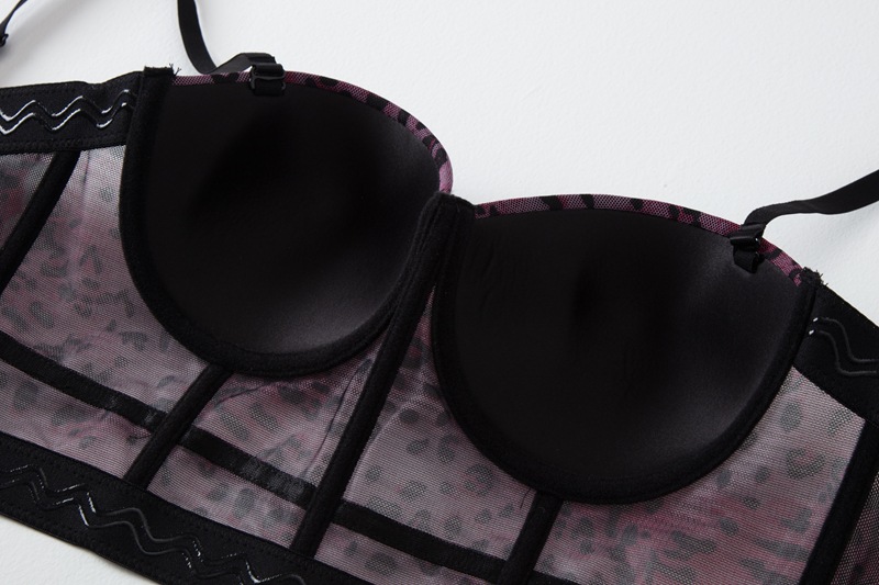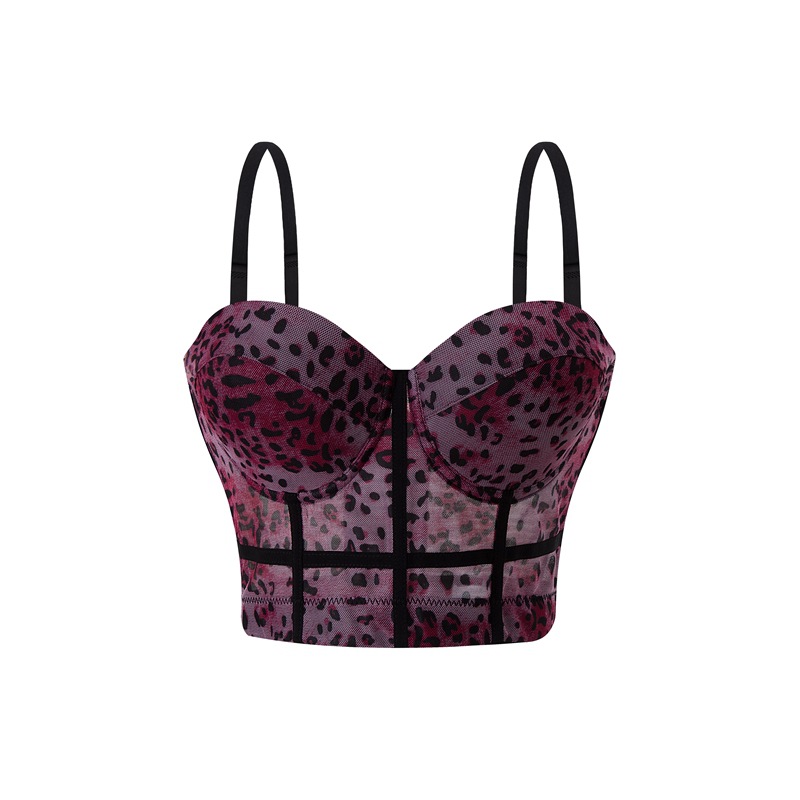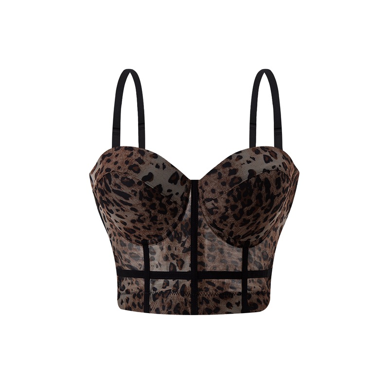 Sexy Leopard Print Stitching Bra Shoulder Straps High Grade Inner Mesh Lace See through Outer Wear Boning Corset Bra