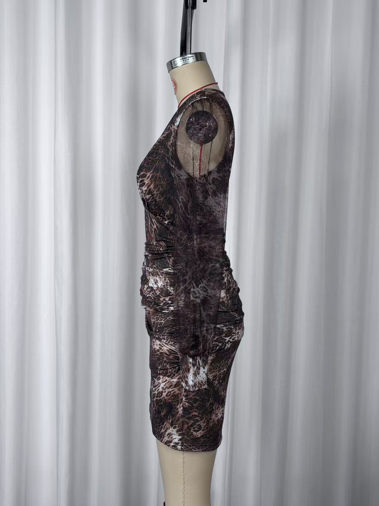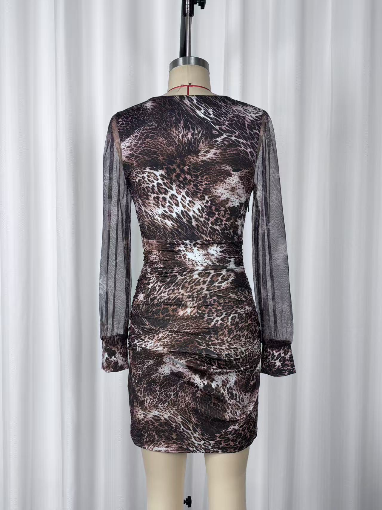Sexy Leopard Print V neck Mesh Stitching Long Sleeves Fitted Waist Pleated Slim Fit Sheath Dress