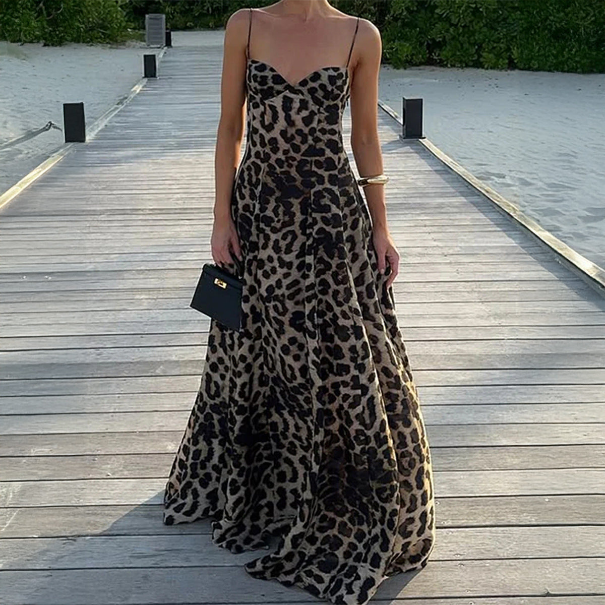 Sexy Sling Leopard Print Maxi Dress Women Clothing Autumn