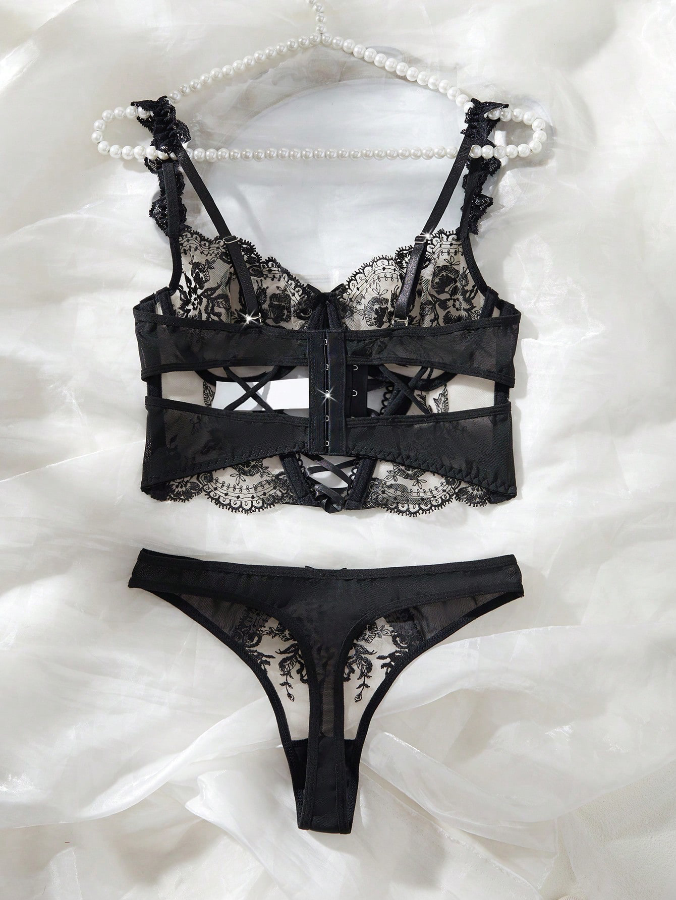 Element: Bow,Cutout,Embroidery,Lace/Tulle/Fishnet,Lace up,hook closure