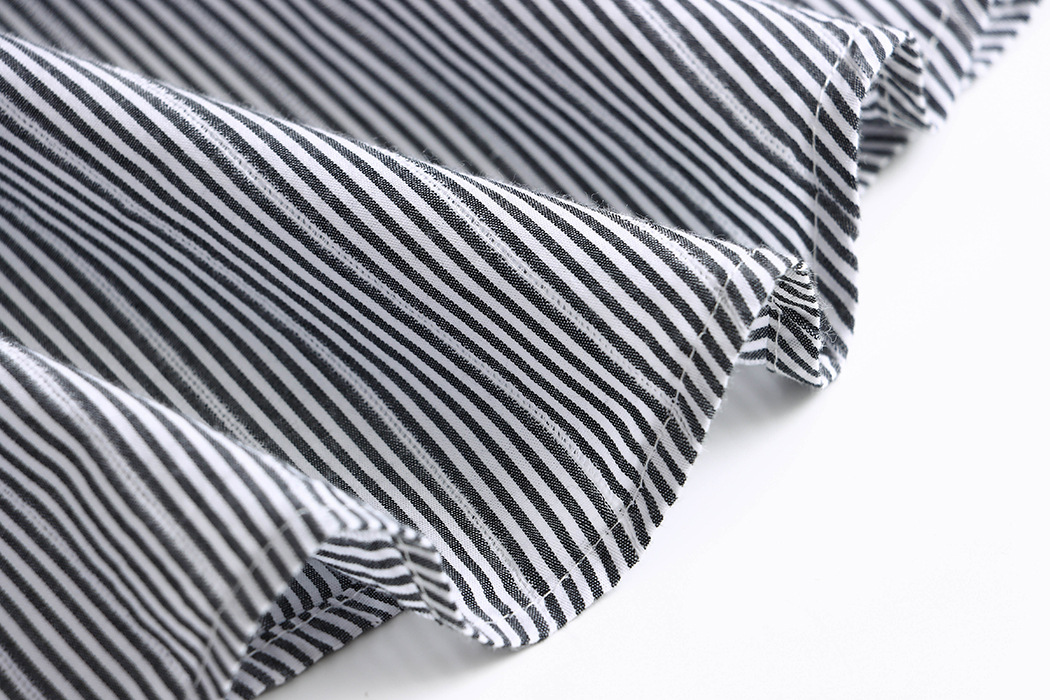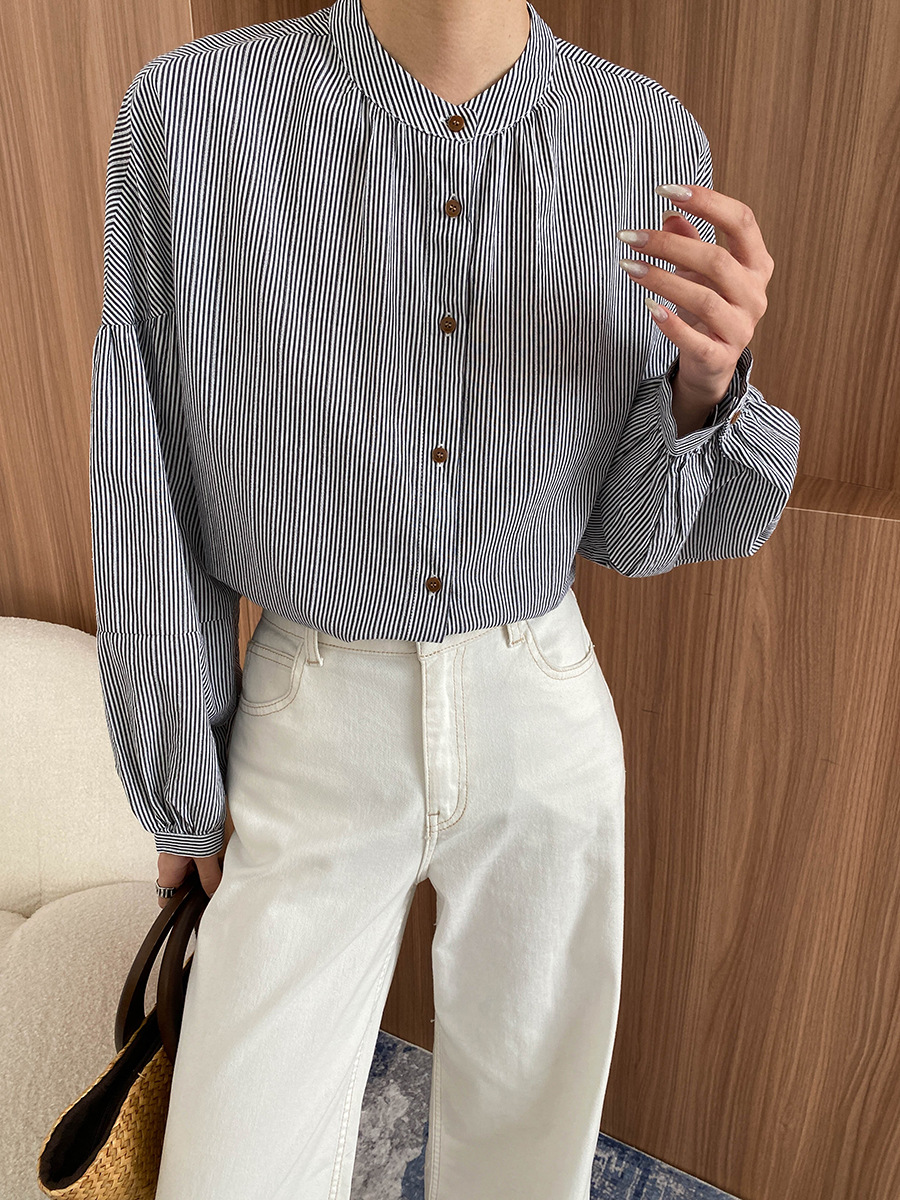 Spring Lazy Elegant Striped Loose Lantern Sleeve Stand Collar Shirt Cotton
