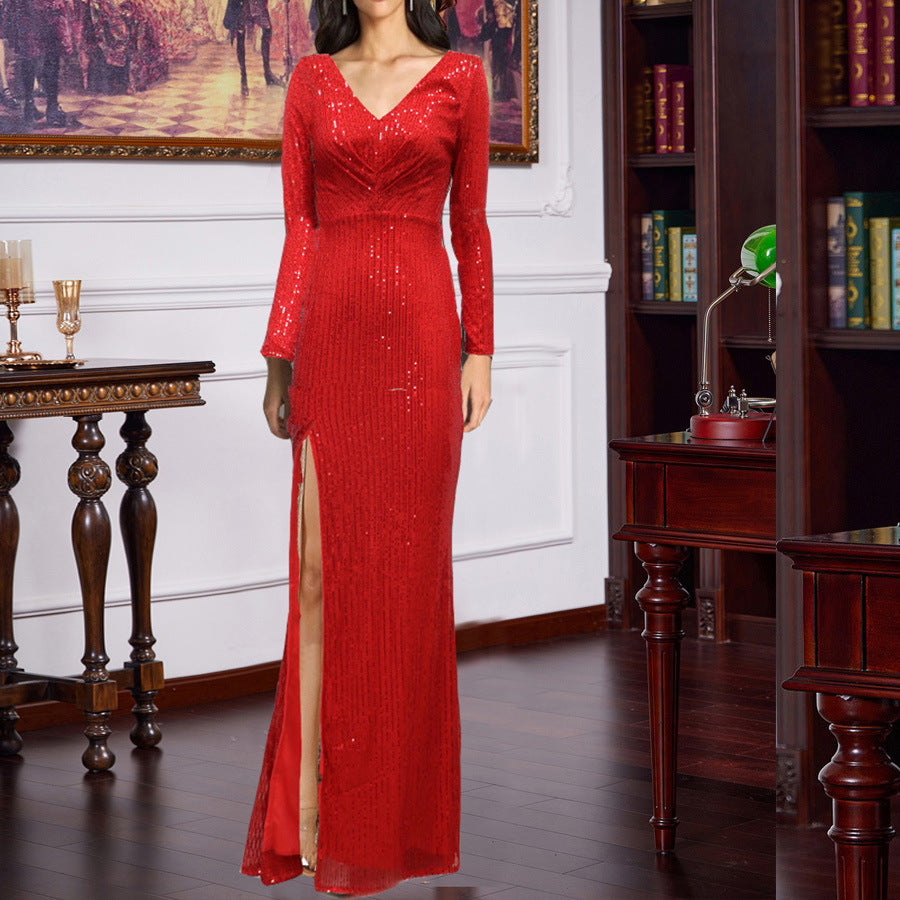 Spring Split Long Sleeve V neck Slim Fit Long Formal Dress Wedding Cocktail Party Multi Color Sequined Evening
