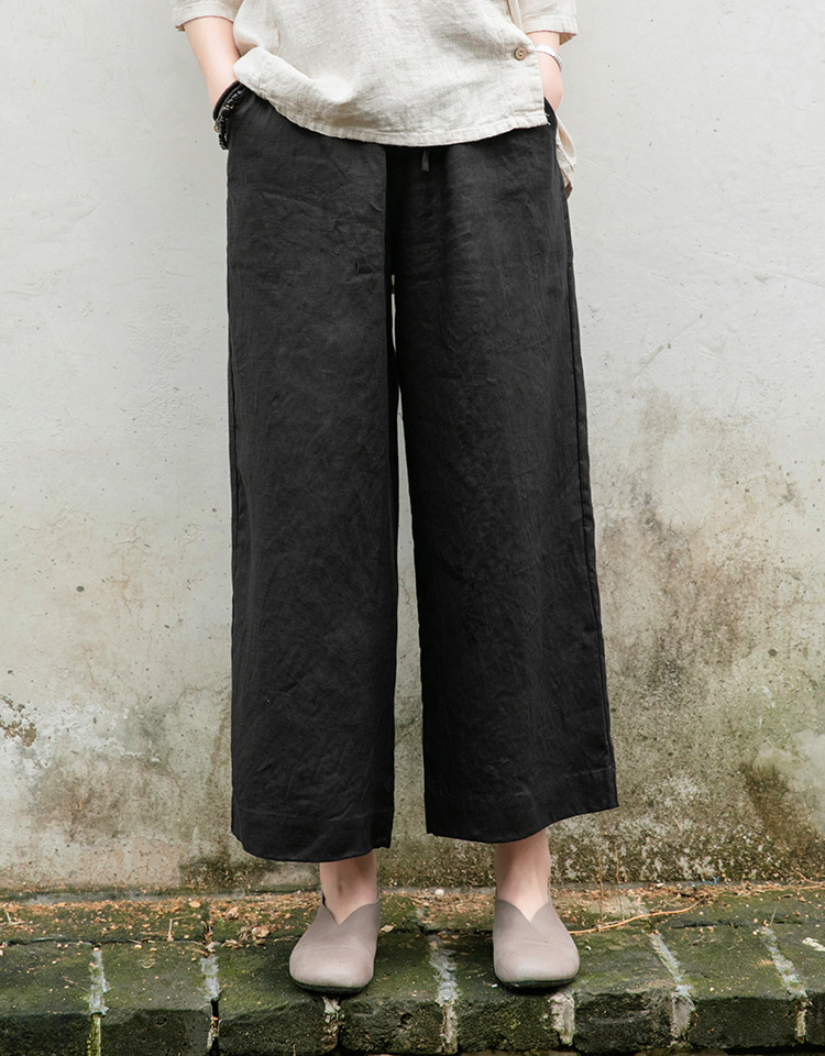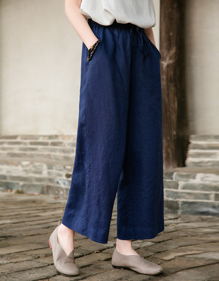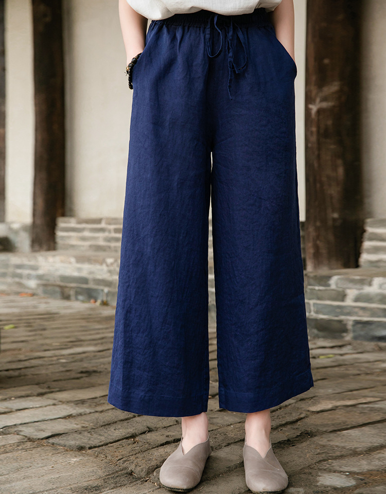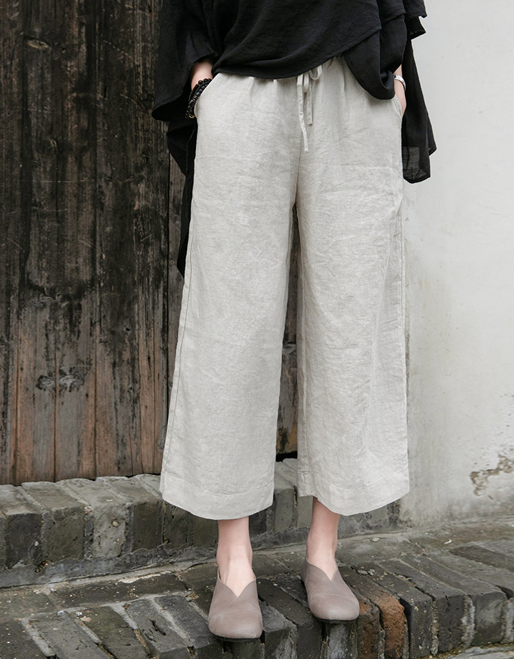 Spring Summer Cotton Linen Women Artistic Washed Lace up Linen Casual Straight Through Cropped Pants Women Cotton Linen Wide Leg Pants