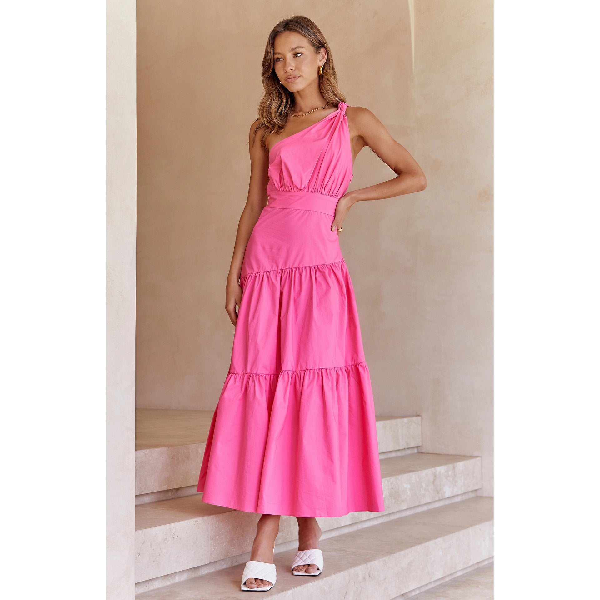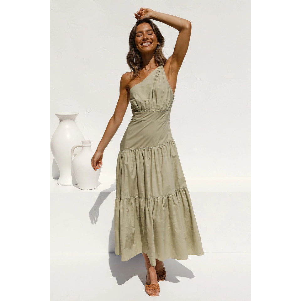 Spring Summer One-Shoulder Knotted Solid Color Fresh Long Sweet Dress