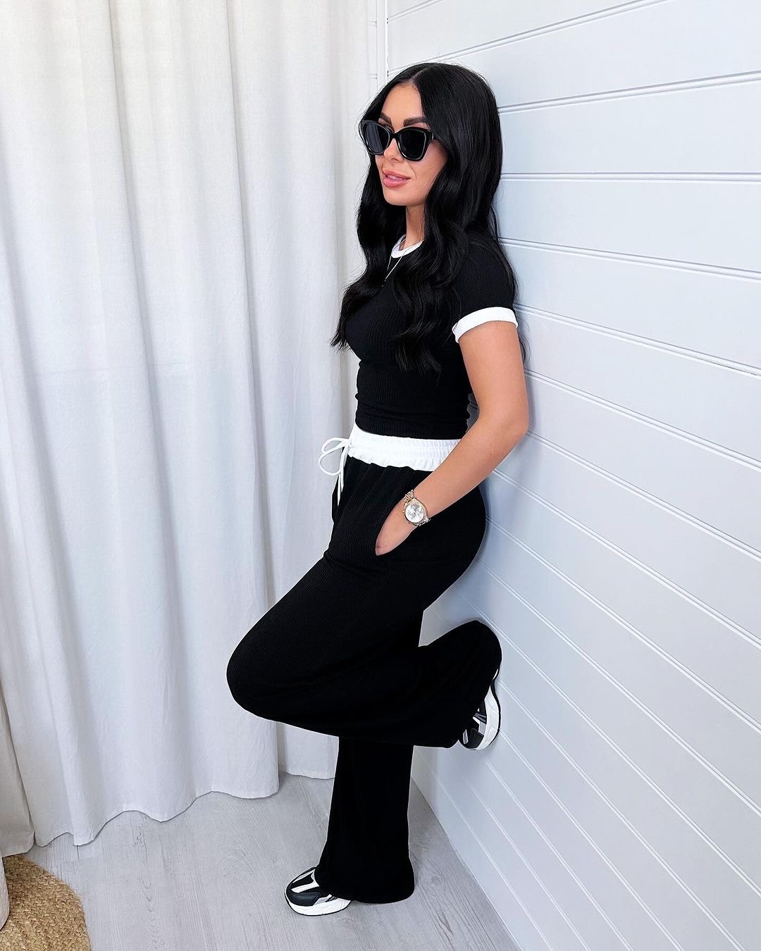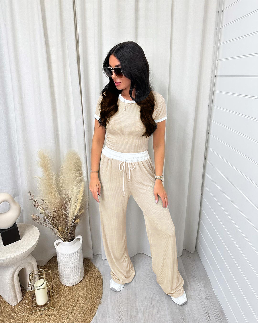Spring Summer Round Neck Contrast Color Short-Sleeved Women Clothing Casual Wide Leg Pants Sports Suit