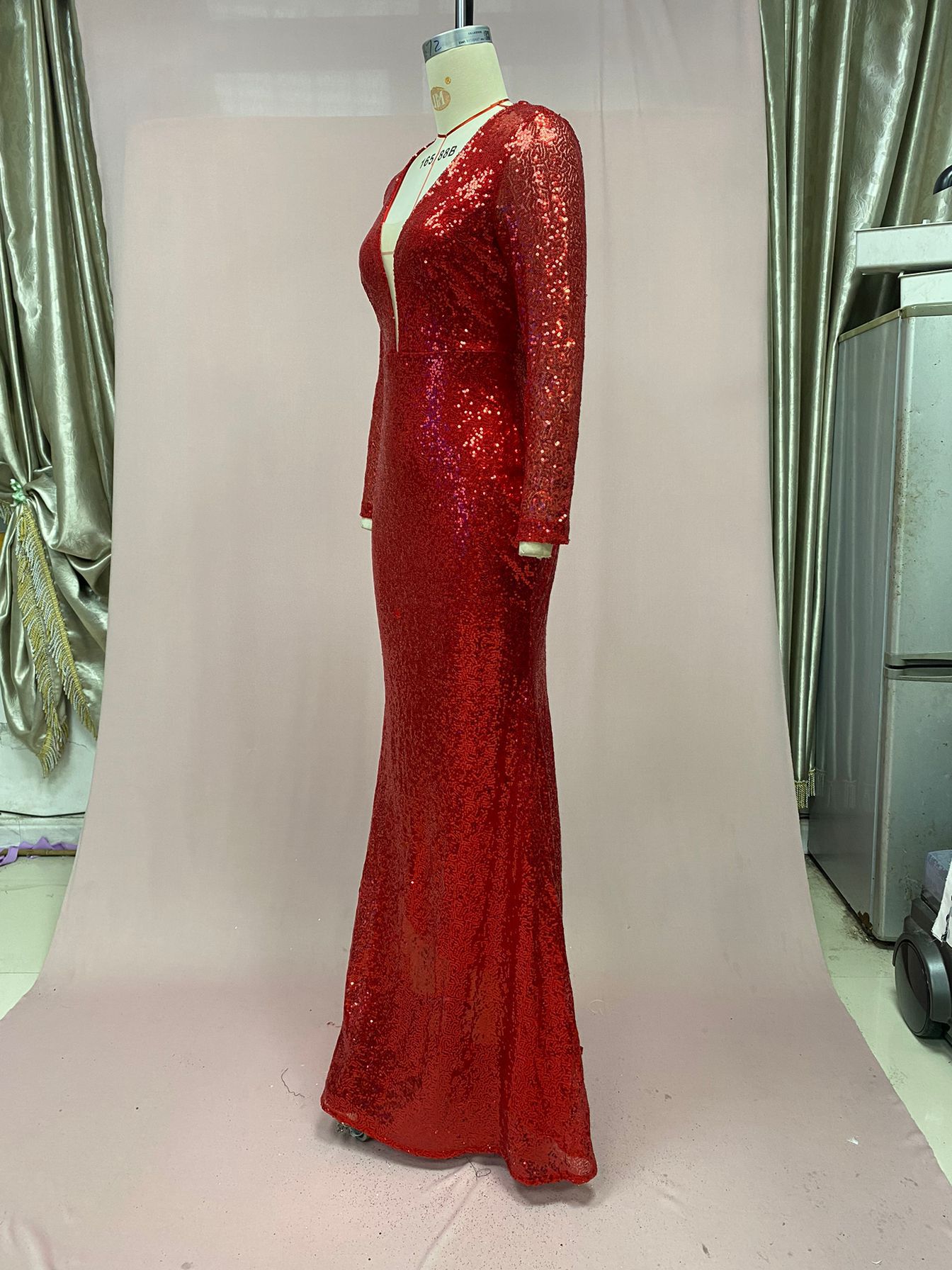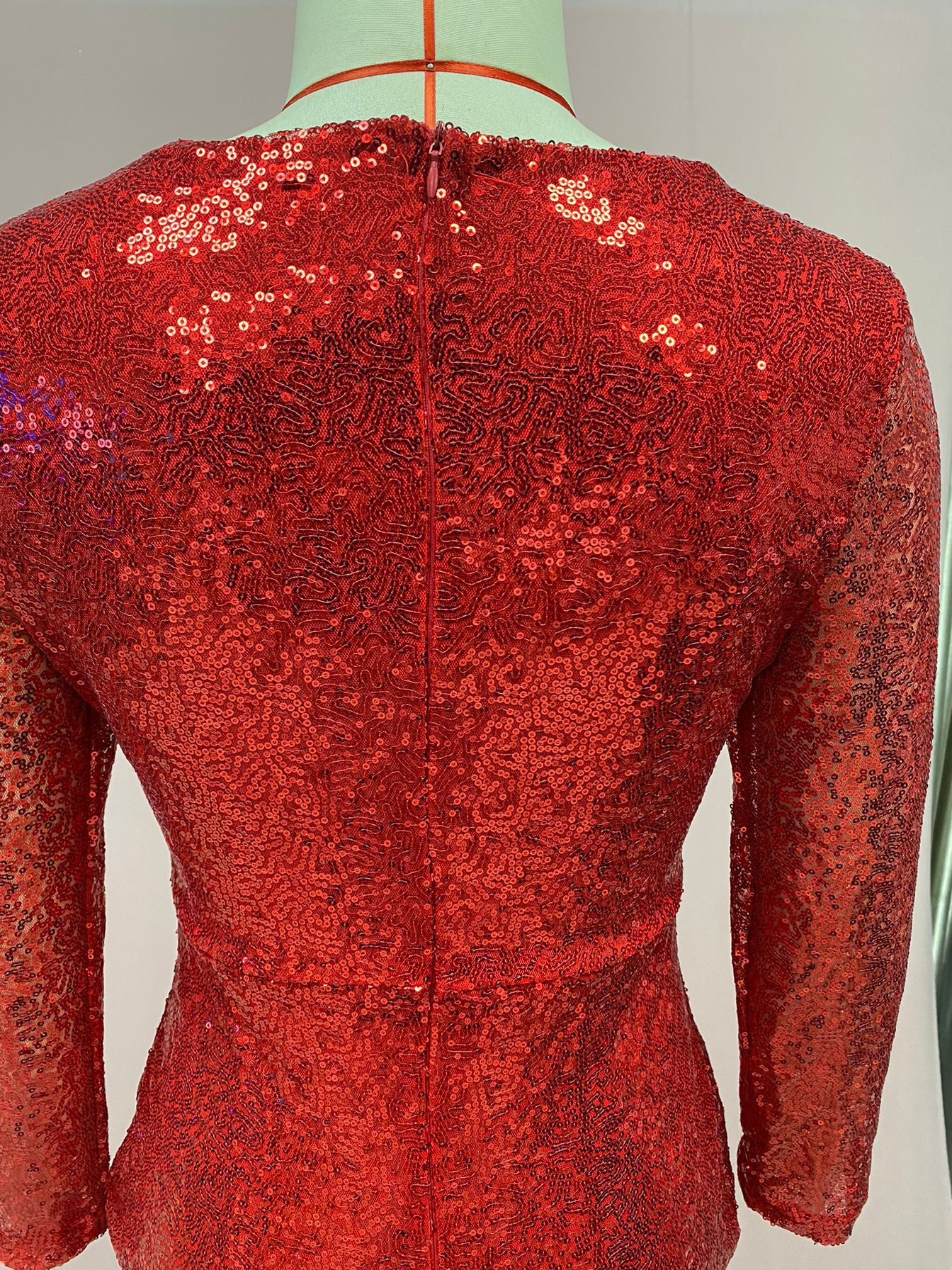 Spring Women Clothing Sheath Dress Fishtail Edge Red Paillette Long Sleeve V neck Dress
