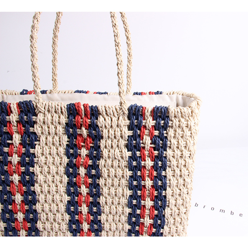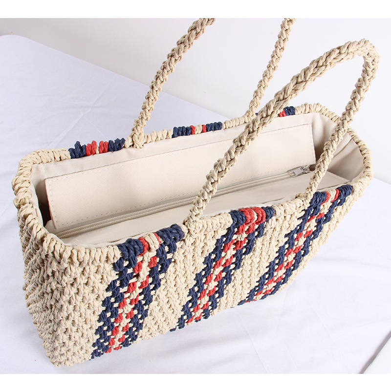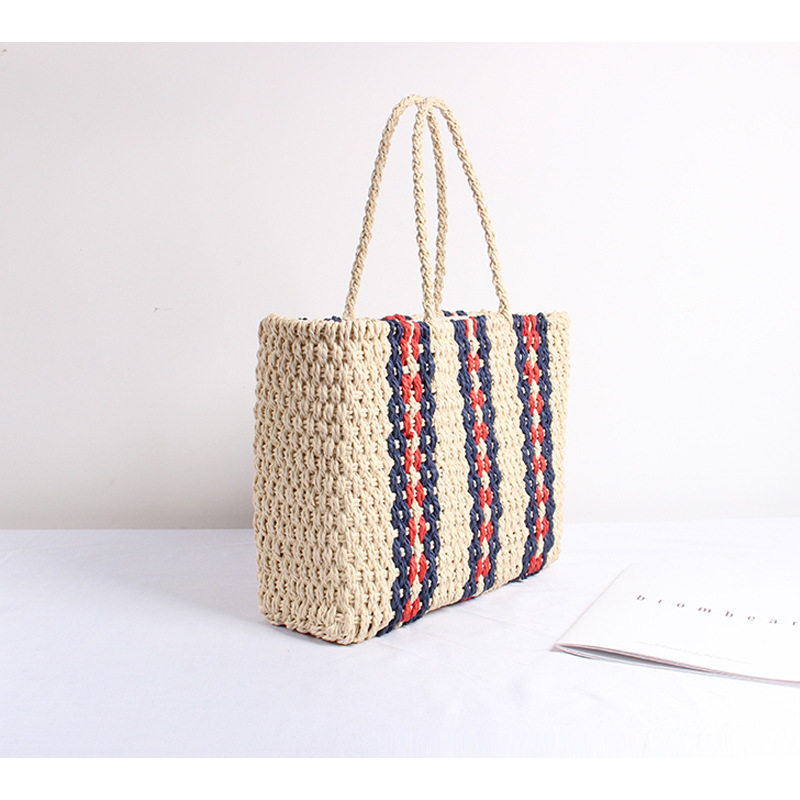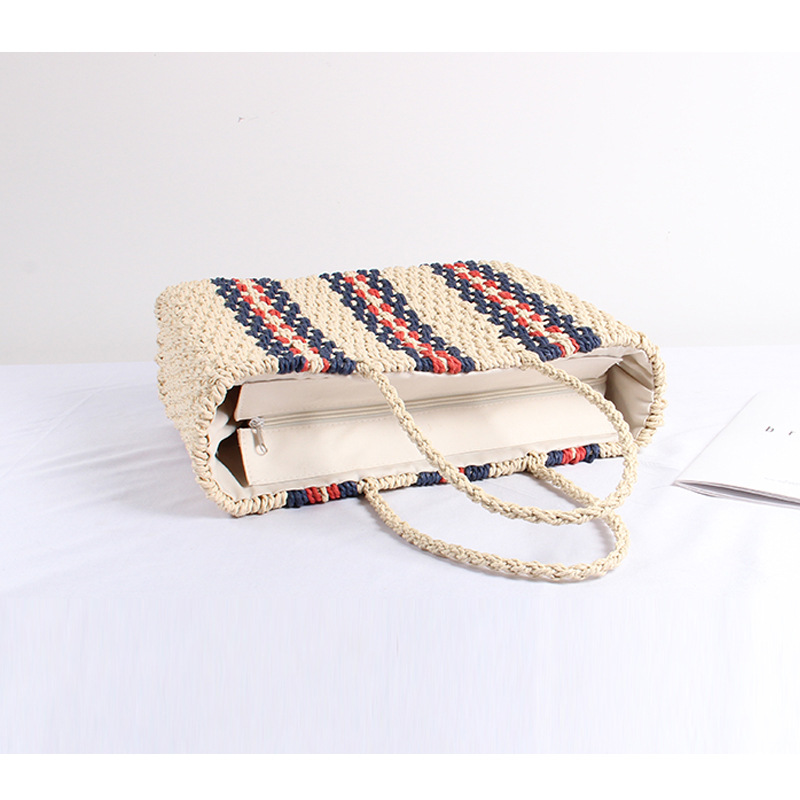 Straw Bag Women Striped One Shoulder Portable Large Capacity Woven Square Bag Travel Vacation Beach Bag