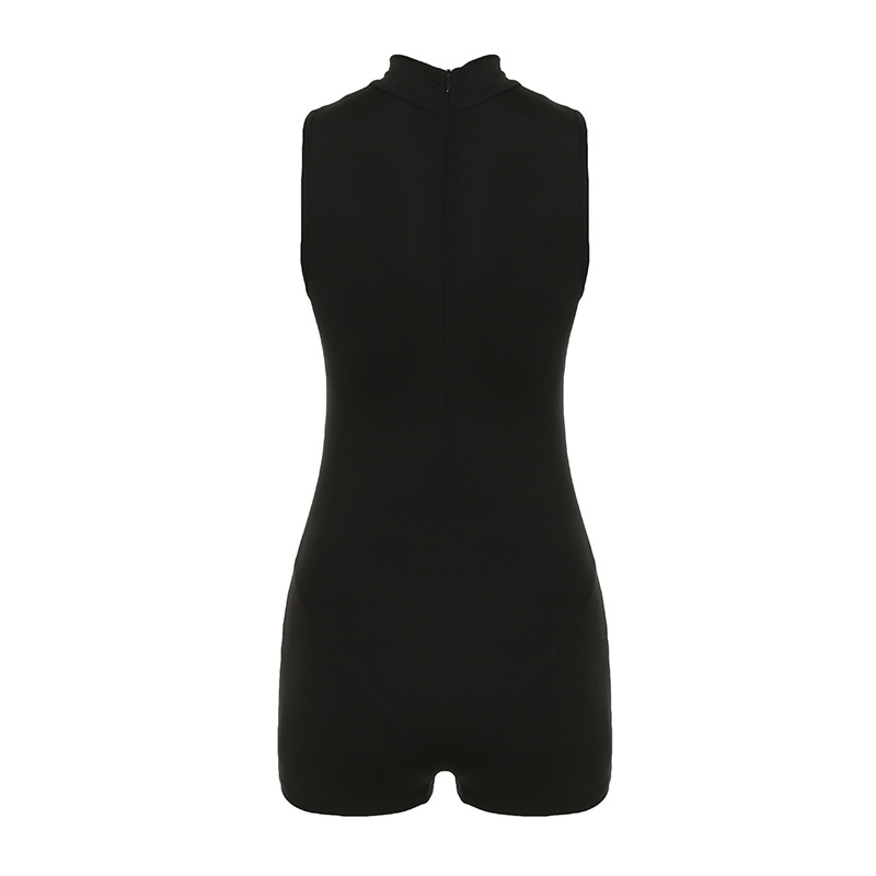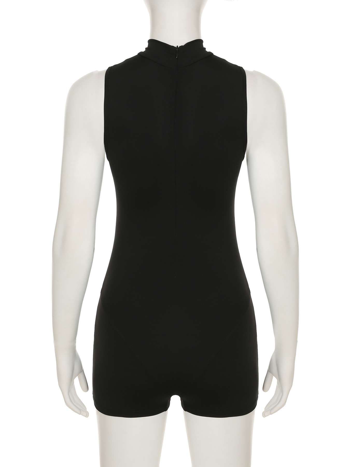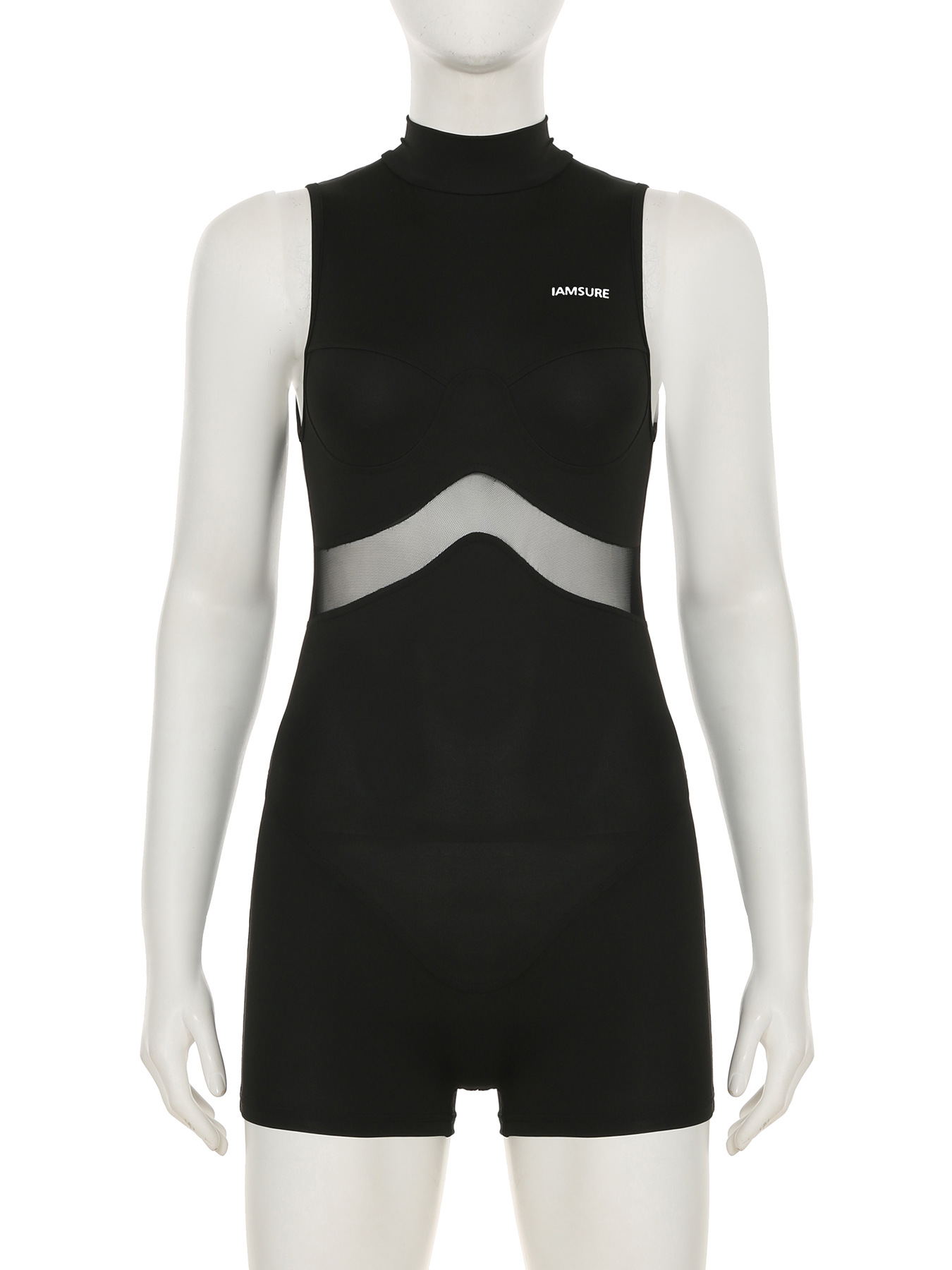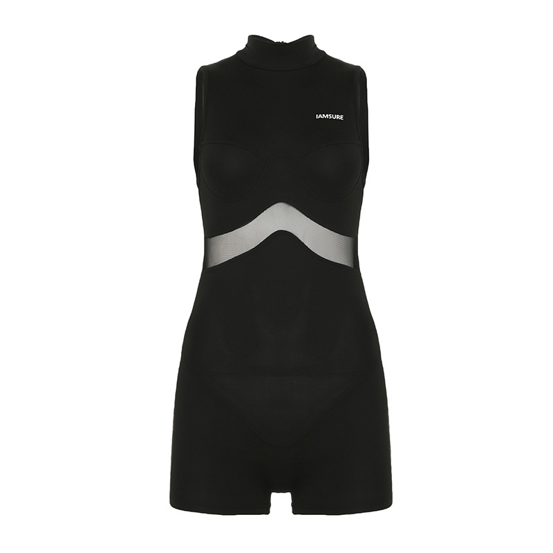Street Mesh Stitching Hollow Out Cutout Sleeveless Romper Sexy Solid Color Tight Sports Waist Shaping Trousers