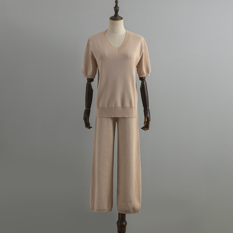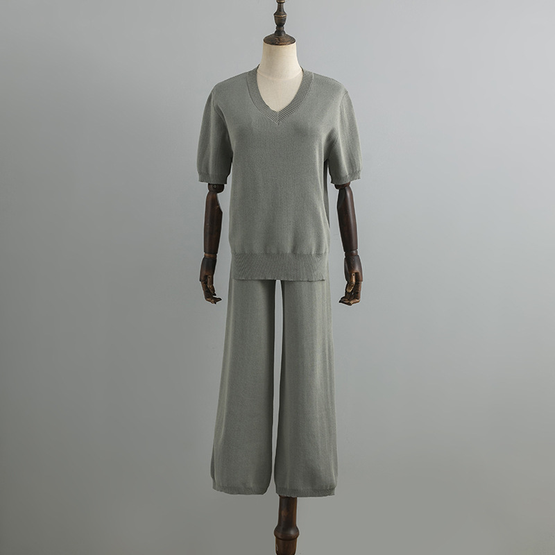 Suit Women V neck Loose Slit Knit Sweater Top Two Piece Set High Waist Waist Drooping Straight Casual Trousers