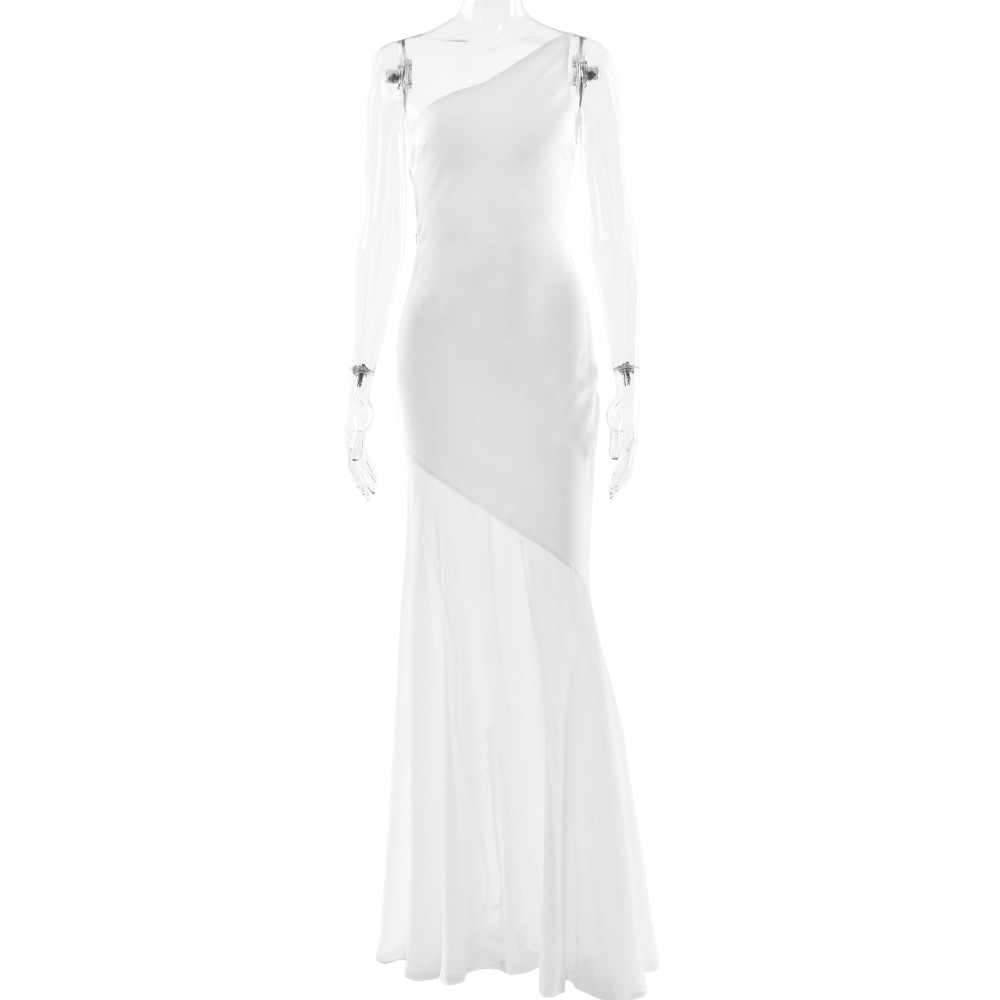 Summer Sloping Shoulder Backless Slim Fit Maxi Dress Sexy Solid Color Mesh Stitching Fishtail Dress