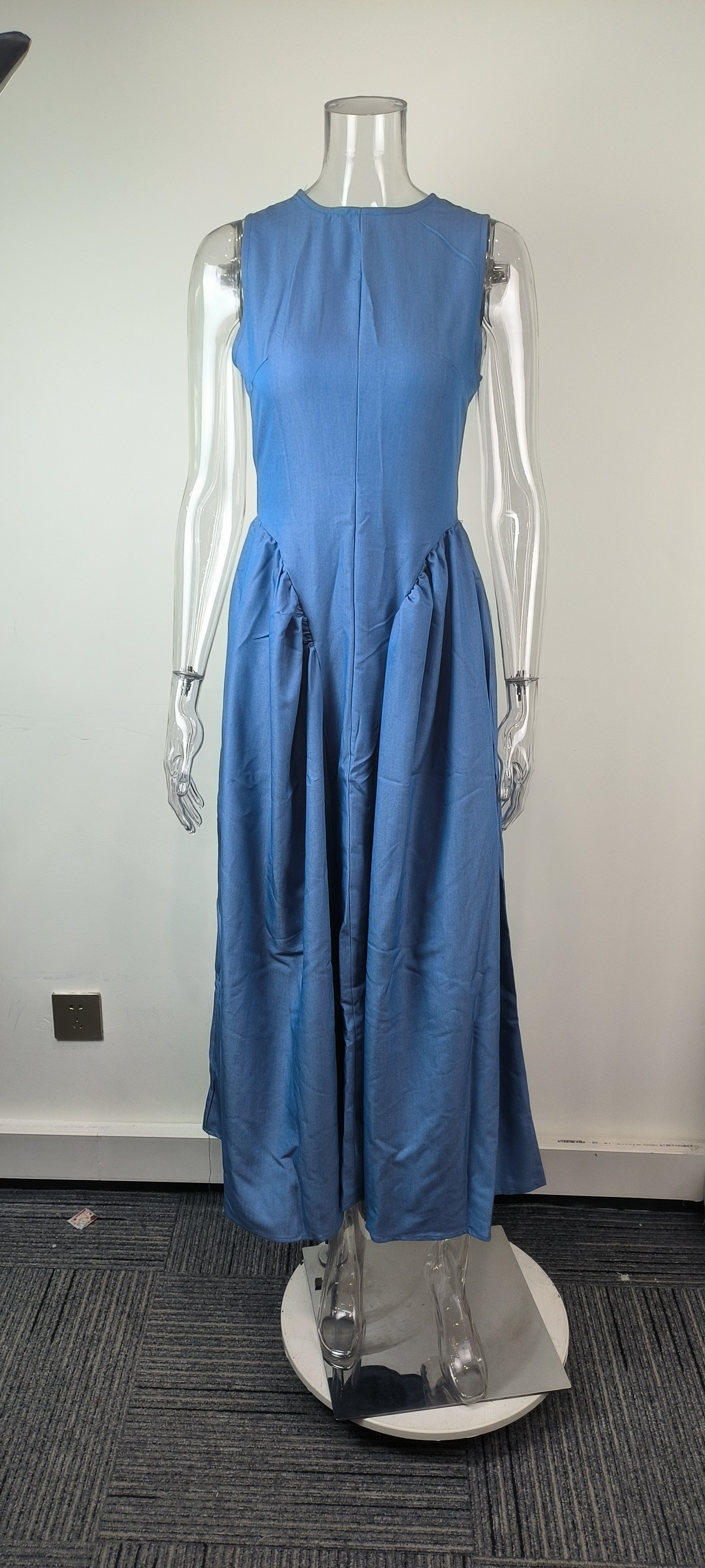 Summer Solid Color round Neck Mid Length Cinched Sleeveless Vest Dress Women